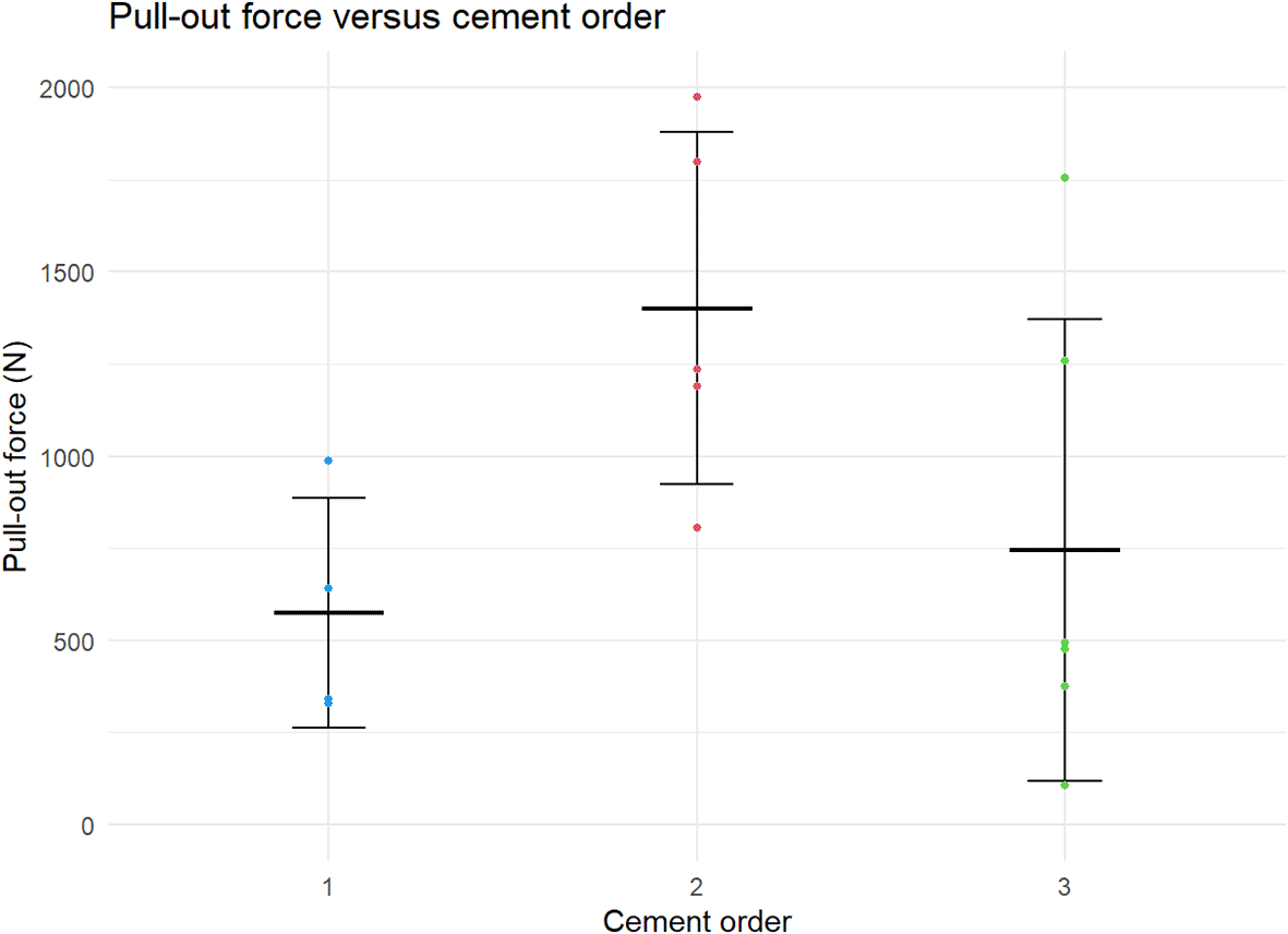 No clear relationship between the heating temperature and the pull-out force was observed (Kruskal-Wallis test: p = 0.535). Likewise, there was no significant difference between controls and grouped heated samples (T-test: p = 0.513). Conversely, when the data was grouped by the order in which they were cemented, the second coupon from a batch of cement appeared to have an increased strength compared to the first and third coupons (Kruskal-Wallis test: p = 0.0757). Even after correction for the cement order, no association between the thermal dose and pull-out force was found.