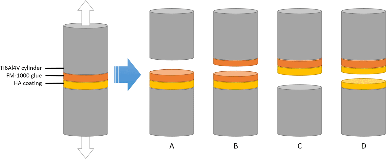 Between the two cylinders, there is a layer of HA that is plasma-sprayed onto the bottom cylinder, and a layer of fm-1000 glue that is applied by pressing one coated and one coated cylinder together under high temperature. If the cylinders are pulled apart, the setup can fail in 4 different ways depending on which force is the weakest: adhesive forces of the glue (A), cohesive failure of the glue (B), adhesive failure of the coating (C) or cohesive failure of the coating (D). According to ISO-13779-2, only failure modes C and D are acceptable.