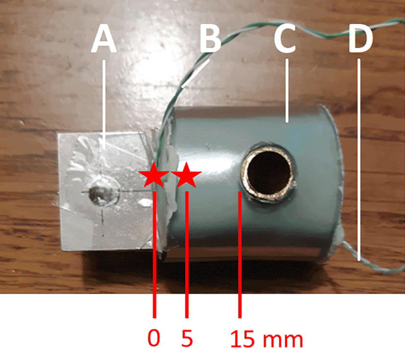 The green cement is mixed and placed inside a transparent plastic tube, through which a copper tube has been drilled. A Ti6Al4V coupon is then inserted into the soft cement, and the cement is allowed to harden. Two thermocouples are attached to the coupon to measure the internal (inside the cement) and external (outside the cement) temperature of the coupon.