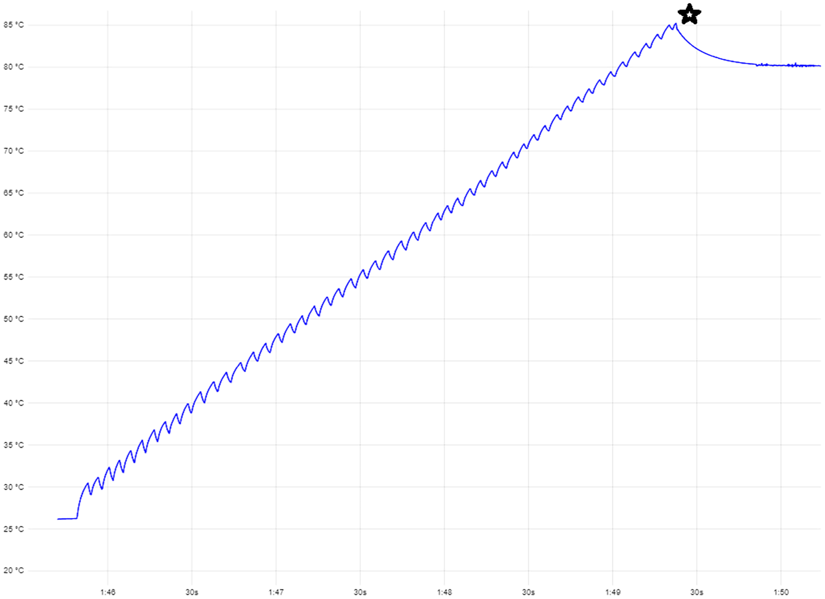 The star represents the failure temperature. The temperature goes up and down at regular interval due to manual activation and deactivation of the induction heating device. The star represents the point where the cement failed and heating was ceased.