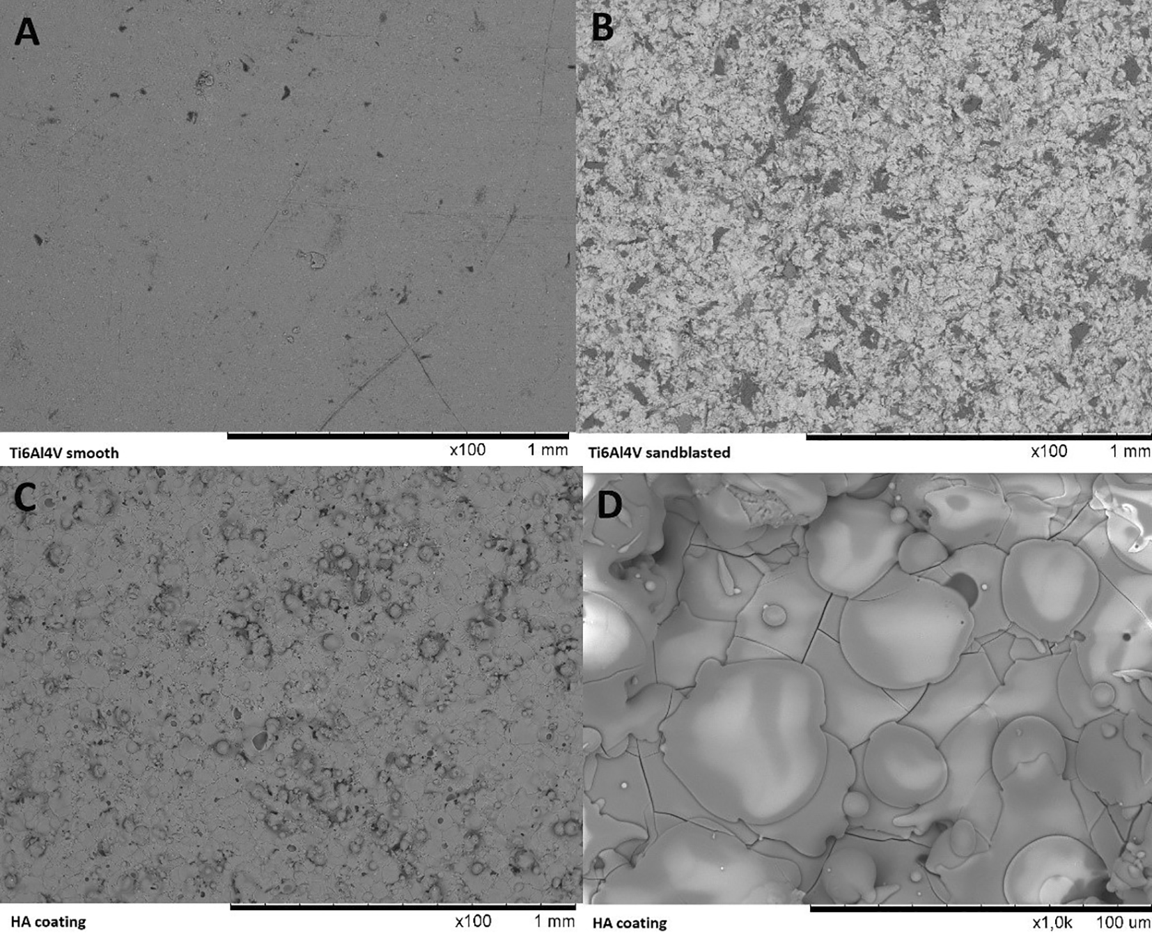 The SEM images show a clear increase in surface roughness between Ti6Al4V before and after sandblasting (see Figure 6). SEM of the HA coating shows the formation of a continuous and fully covering layer of HA has formed on the metal surface. The surface features of the HA coating show where individual molten particles of HA have struck the surface.