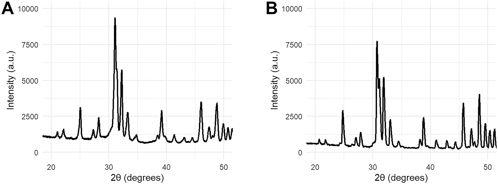 XRD patterns were used to obtain the crystallinity ratio and the phase purity according to the method described in ISO 13779-3.15 The phase purity was assessed by qualitatively assessing the presence of peaks not belonging to HA. If such peaks were present, the phase purity was determined by comparing the measured ratio of peak integrals with a calibration curve established by mixing the component phases in a known ratio. The crystallinity ratio was obtained by comparing the peak integrals of 10 peaks known to belong to HA before and after sintering. The XRD measurement for determining the crystallinity ratio was always preceded by measuring the same alumina reference sample. The crystallinity ratio was calculated using the following formula: