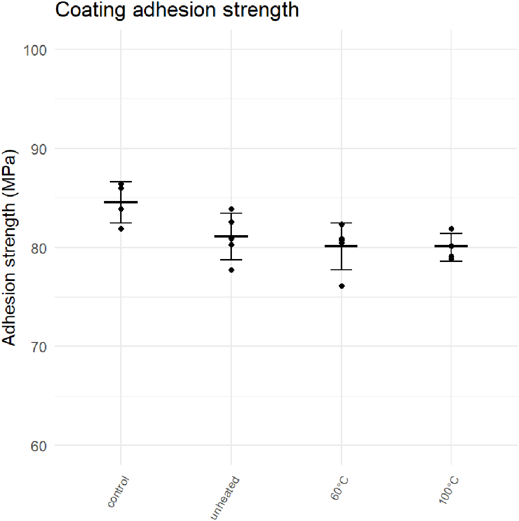 The adhesion strengths of Ti6Al4V cylinders are shown in Figure 8. Most failure modes were of type A for uncoated control samples and C for coated samples. However, two controls exhibited a mixed A/B mode of failure with some cohesive failure of the glue, most likely due to incorrect levelling of the surface of the cylinders. One sample from the 100°C group was rejected despite a mode C failure after a human error made it unsuitable for testing. After omission of this sample from further analysis, a sensitivity analysis was performed, showing that all results of this study remained similar and the conclusions did not change. On average, the strength of coated samples and uncoated controls was 80 MPa and 85 MPa, respectively (T-test p = 0.019). This indicates that the FM-1000 glue used for the experiment was stronger than the adhesion strength of the HA coating, making it suitable for the experiment. It is important that the glue is stronger than the coating in order to properly distinguish between different modes of failure. No significant difference in adhesion strength was measured among coated samples grouped by heating temperature (one-way ANOVA p = 0.697).