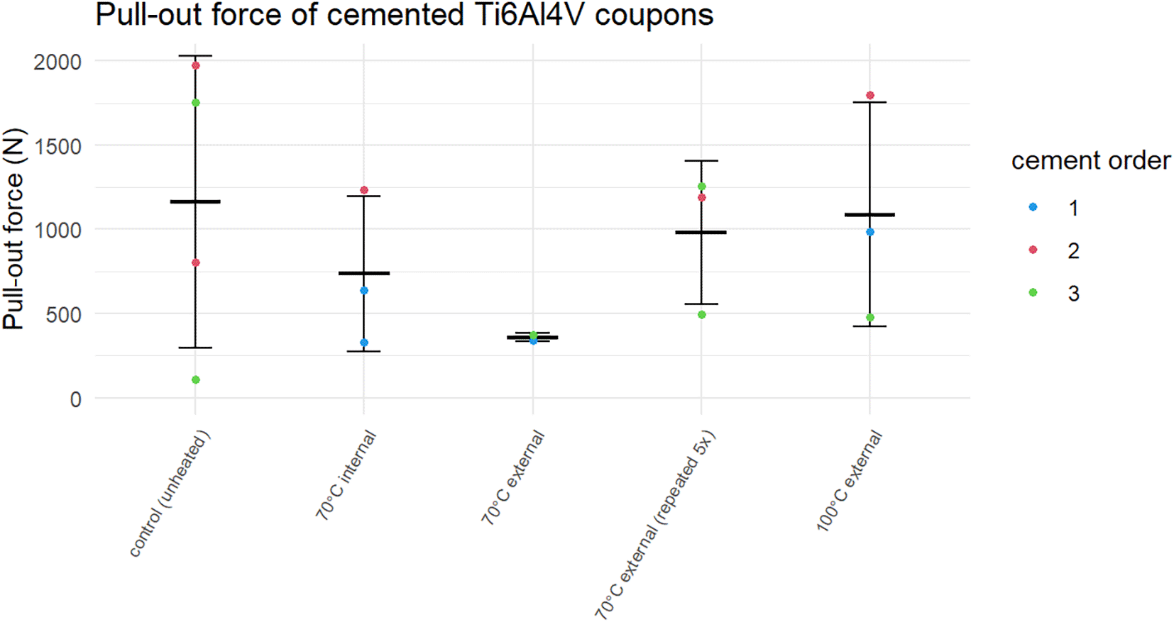 The internal temperature that caused failure for re-inserted samples loaded with a weight of 2.5 kg was 83°C with a SD of 11°C. One sample was excluded because the titanium coupon did not disengage from the cement at 150°C. Detailed data on the pull-out force of individual samples can be found in the Underlying data.21