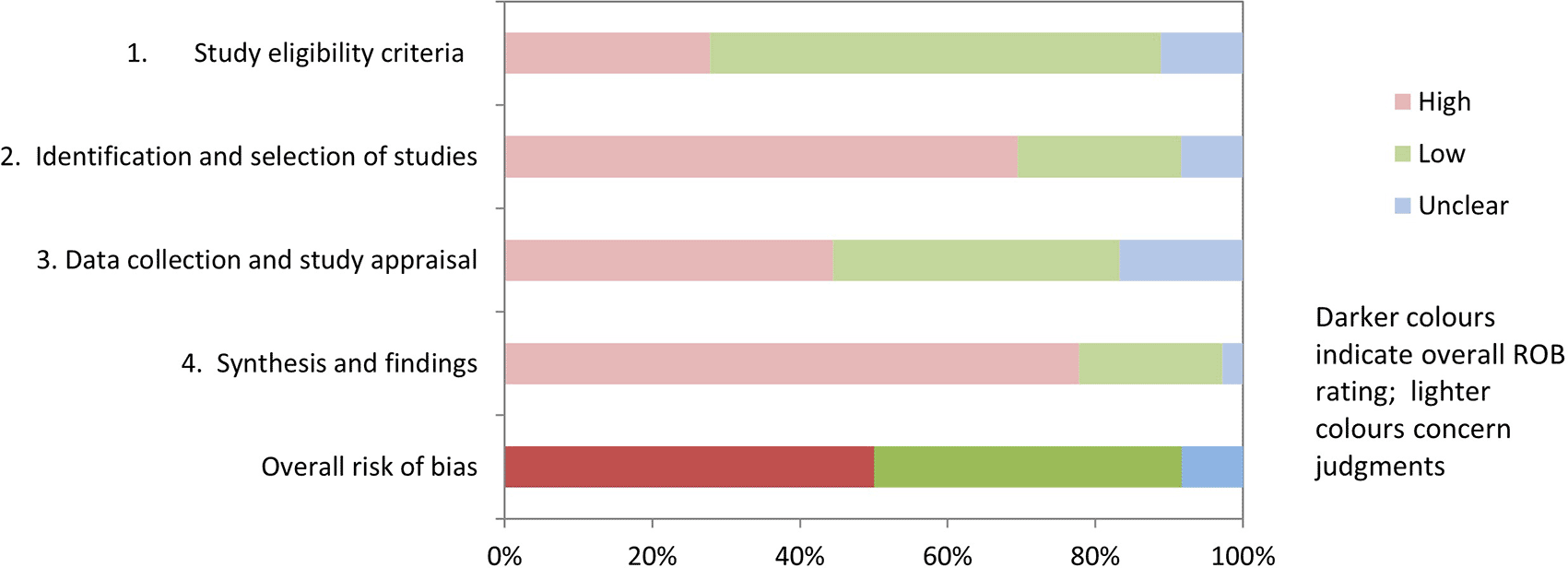 Half of the systematic reviews (50%) had a high risk of bias, and three (8%) studies were categorised as having ‘unclear risk’. The remaining 15 (42%) studies were deemed low risk using the ROBIS tool (Figure 1; extended data: Supplementary Table S2).
