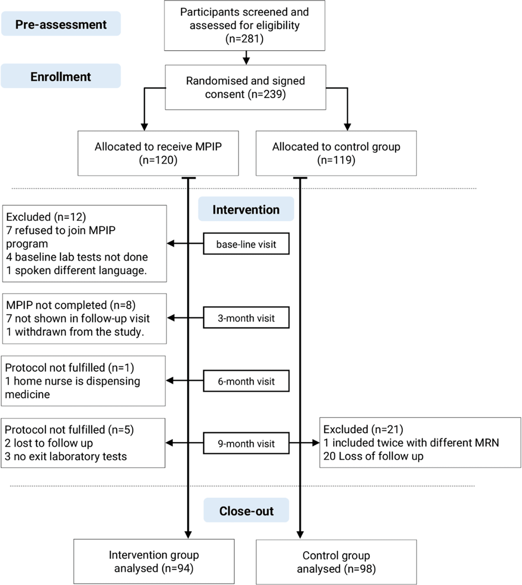 Between July and September 2021, 316 patients visiting the endocrinology and CDC clinics were screened for eligibility, and 281 eligible patients for inclusion were invited to participate in the study. Only 239 patients were agreed to sign the consent form and randomised to either the pharmacy intervention group (120 patients) or the control group (119 patients).