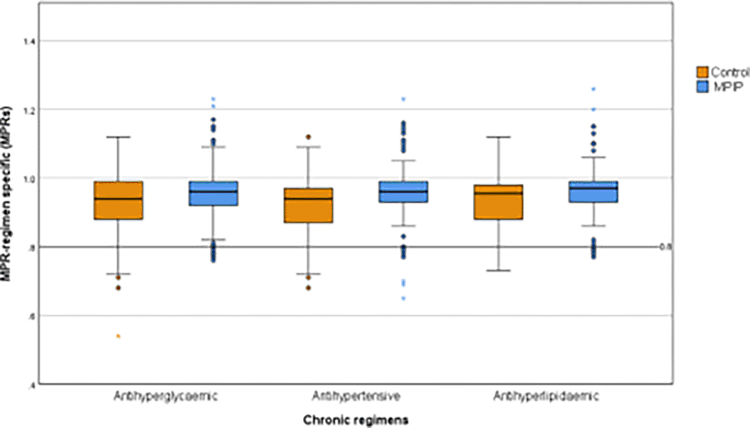 Regimen-specific MPRs were calculated for all three regimens (antihyperglycaemic, antihypertensive, and antihyperlipidaemic), whether any or all were contained in the patient’s medication profile.21,22