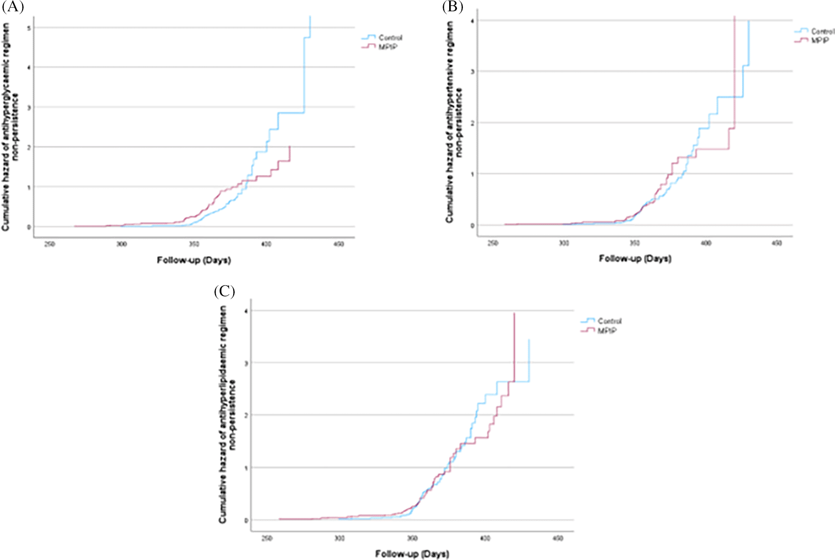 Demographic and clinical data presented as categorical variables were analysed using the chi-square test, and the student’s t-test was used for continuous variables. T-test was also used to estimate the mean differences and confidence intervals for the MPR. Moreover, Cox proportional hazard analysis were utilised to compare regimen non-persistence in antihyperglycaemic, antihypertensive, and antihyperlipidaemic medications in the intervention group compared with the control group.