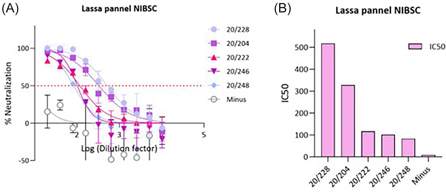 (A) Reference antisera were used at starting dilution of 1:20 while LASV PV diluted to 1.000.000 RFU dose input as determined previously from titration. Each points represents the mean and standard deviation of two replicates per dilution repeated for three independent experiments. (B) Half-maximal inhibitory dilution of reference antisera as calculated from “log (inhibitor) vs. normalized response—Variable slope” from “Dose-response-Inhibition using Graph pad software. The values are previously normalized on only mean value of PV value and cell-only mean value.