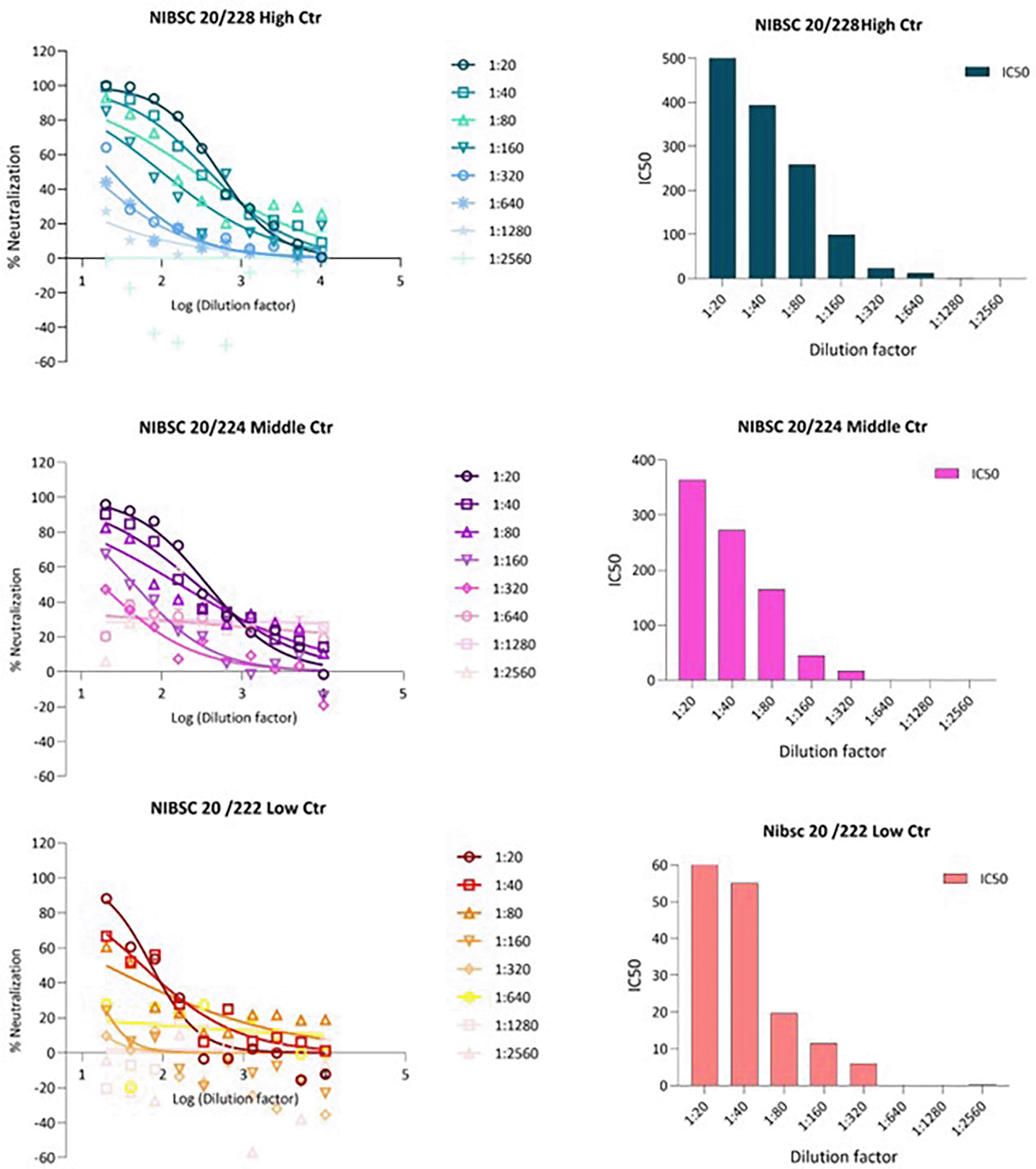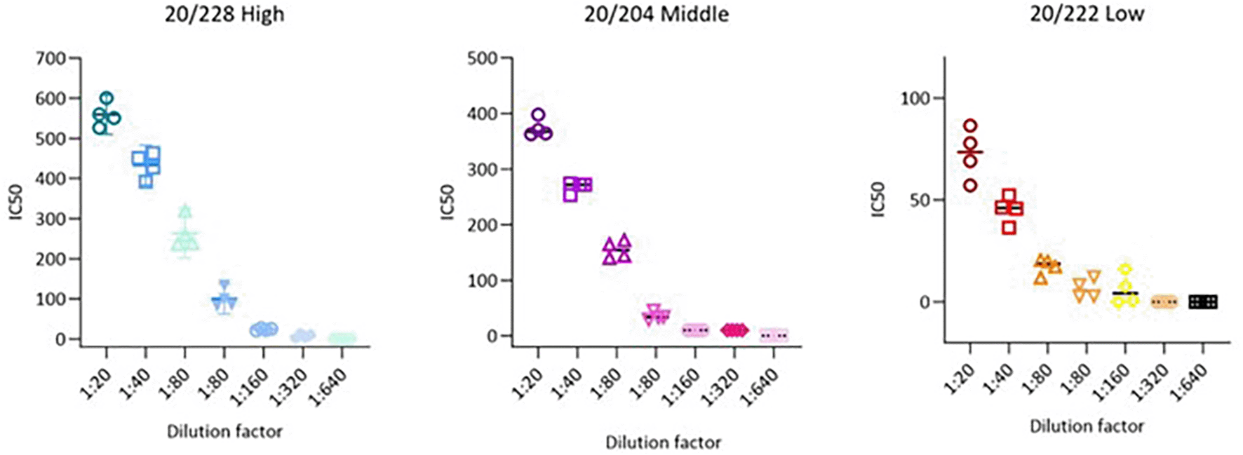 This panel consisted of 5 sera (20/228, 20/204, 20/222, 20/246 and 20/248) and was established by an expert committee on biological standardisation in 2021. First, the IC50 of all 5 sera in the panel were tested against LASV GP pseudotypes/plate and 20/228 was selected as high control, 20/204 as medium and 20/222 as low control, Figure 2.