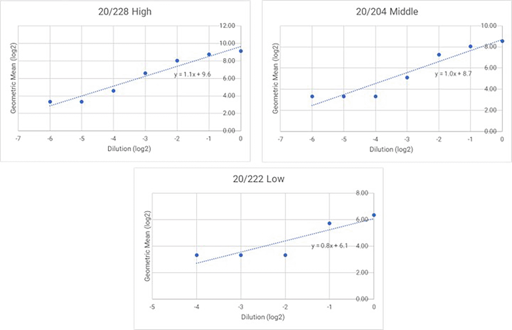 Linearity is assessed by testing the 20/228, the 20/222 and the 20/204 samples from NIBSC reference panel for anti-Lassa fever virus in a two-fold dilution scheme, starting from a dilution of 1:20 to 1:2560 dilution The sample dilutions were tested in two repetitions per plate, and in two different plates by two different operators, on two different days. For each dilution, the geometric mean titre (GMT) is calculated. A linear regression analysis of logarithm base 2 of serum dilution versus logarithm base 2 of GMTs using the least squares method over the entire dilution range is performed and the slope of regression line and the coefficient of determination (R2) is calculated.
