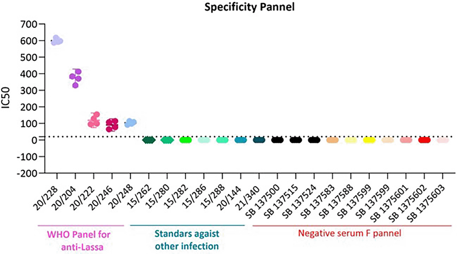 The assay will be considered specific if Lassa serum have at least a four-fold difference (i.e., ≥ 4-fold) to the heterologous panel and negative panel.