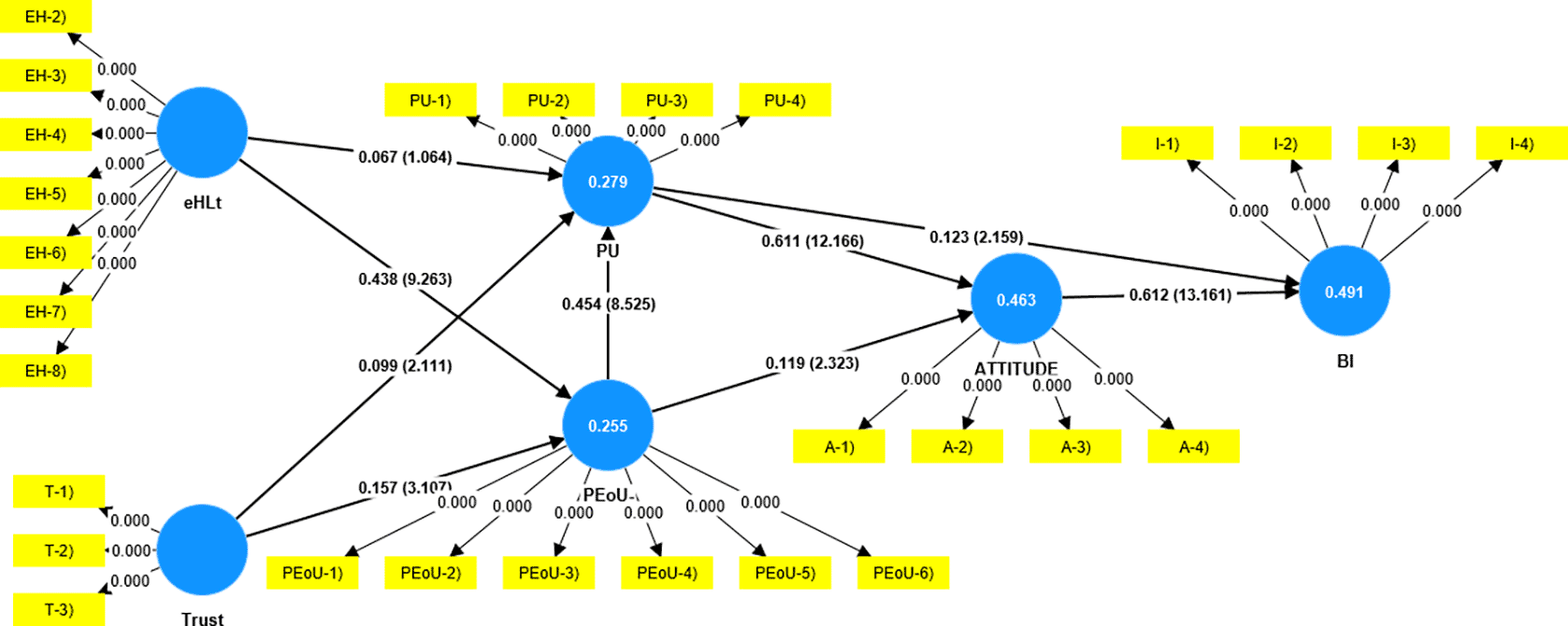 The hypothesis-testing results are presented in Table 4. The results revealed that trust had a significant impact on PU (β = 0.099, t = 2.111, p = 0.035) and PeoU (β = .157, t = 3.107, p = 0.002). eHLt had a significant impact on PEoU (β = 0.438, t = 9.263, p = 0.000), and PEoU had a significant impact on PU (β = 0.454, t = 8.525, p = 0.000). PU (β = 0.611, t = 12.166, p = 0.000) and PEoU (β = 0.199, t = 2.323, p = 0.020) influenced attitude. PU partially influenced BI (β = 0.123, t = 2.159, p = 0.031) and attitude had a significant influence on BI (β = 0.612, t = 13.161, p = 0.000). The analysis revealed an insignificant impact of eHLt on Perceived Usefulness (β = 0.067, t = 1.064, p = 0.288).