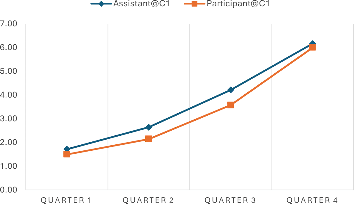 The analysis indicated the progression scores across various time intervals in two separate conversations, offering quantitative insights into how well the AI assistant adhered to the expected 7-step progression plan during narrative interviews. Table 2 shows a consistent increase in progression scores from Quarter 1 to Quarter 4 in both conversations, indicating that the conversations advanced methodically through the planned stages. In Conversation 1, the progression scores of the Assistant move from 1.71 to 6.17, and in Conversation 2, from 1.56 to 6.00, reflecting a structured and coherent unfolding of the narrative as intended by the conversation plan. Similar patterns were observed in the participant progression scores.