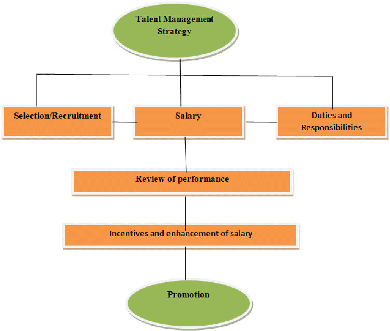 Figure 2 shows that talent management strategy constitutes three major aspects: selection and recruitment, salary commensurate with qualifications and experiences of the employee, and allocation of duties and responsibilities. The next step is to review the performance of employees in line with the objectives and goals of the library, followed by incentives and enhancement of the salaries of the deserving candidates. The endpoint of the talent management strategy should be the promotion of talented employees.