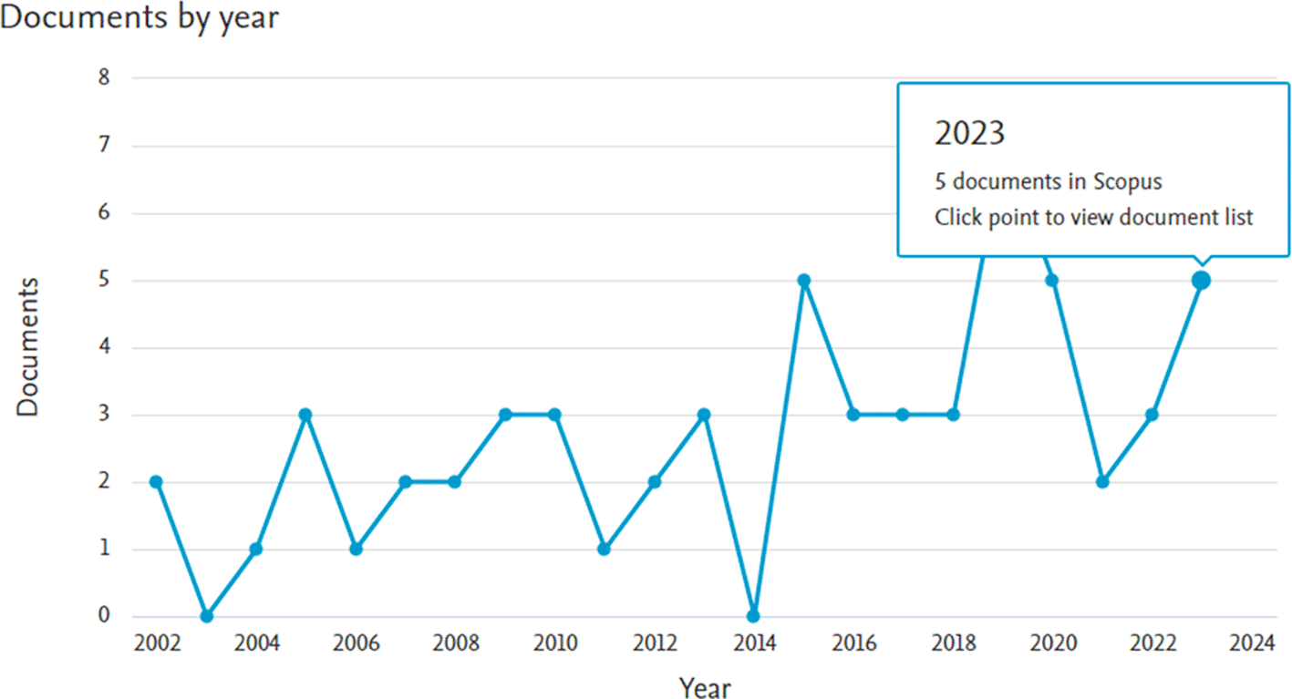 Based on Figure 1, it appears that there has been an increase in the number of documents, until in 2023 there were 5 documents. The oldest document in 2002 was entitled Gastric electrical stimulation in intractable symptomatic gastroparesis., written by Abell, T. L et al.,7 Next is the article entitled Physiology and pathophysiology of the interstitial cells of cajal: From bench to bedside VI. Pathogenesis and therapeutic approaches to human gastric dysrhythmias written by Owyang, C., and Hasler, W.L.8 Meanwhile, the latest document in 2024 is entitled F Non-invasive neuromodulation: an emerging intervention for visceral pain in gastrointestinal disorders written by Alam, M.J. and Chen, J.D.Z.9 Next is the article entitled Transcutaneous electrical stimulation for gastrointestinal motility disorders written by Song, G. et al,10 next article is Gastric peroral endoscopic myotomy for management of refractory gastroparesis in patients with gastric neurostimulator devices: a multicenter retrospective case control study written by Ichkhanian, Y. et al.11 next article is Electroceuticals for Neurogastroenterology and Motility Disorders written by Jiang, Y. and Soffer, E.12 And next article is Noninvasive electrical neuromodulation for gastrointestinal motility disorders written by Yin, J. and Chen, J.D.Z.13