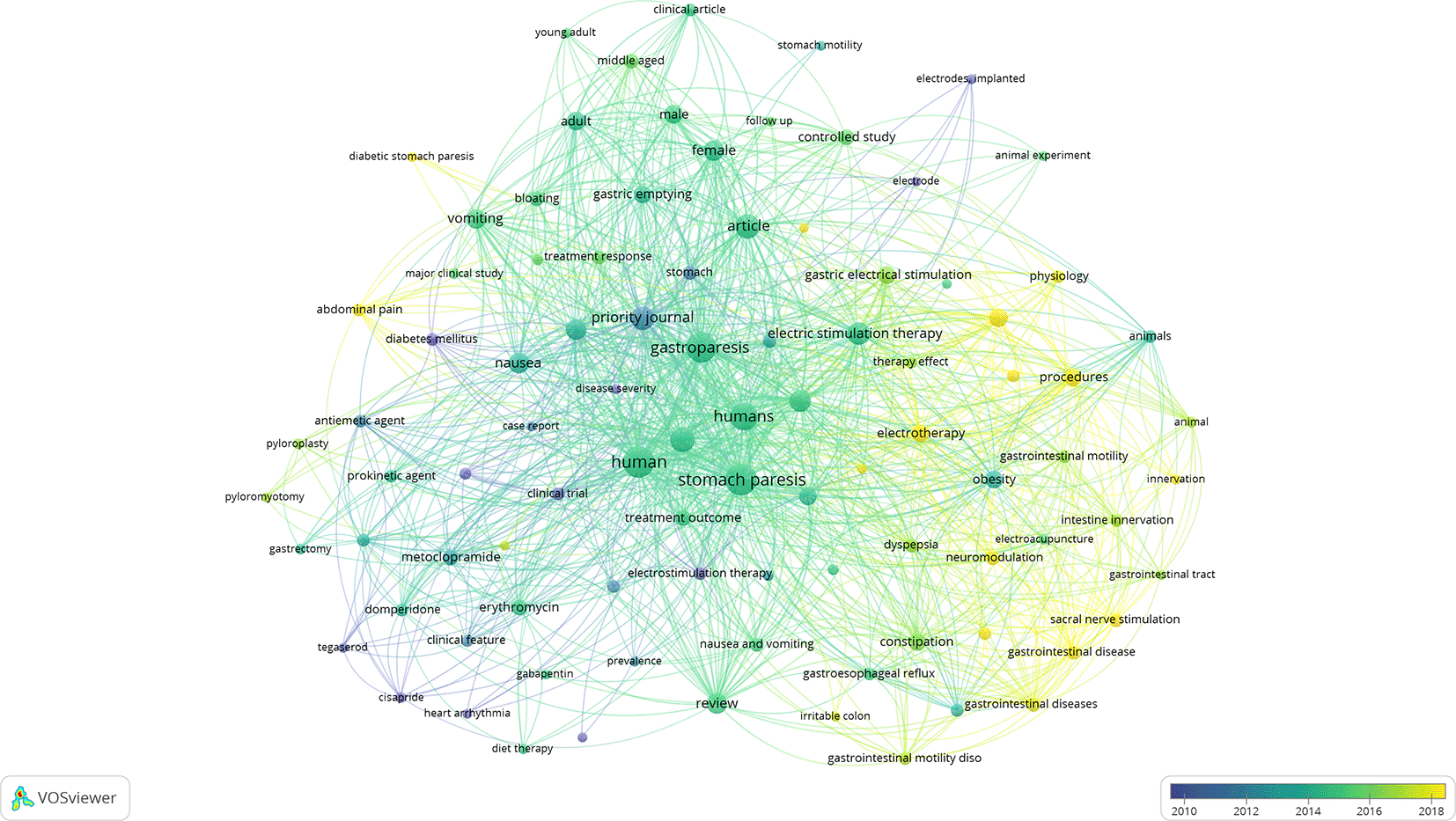 Based on Figure 10. In the overlay visualization, it appears that the keywords that are being researched a lot approaching 2018 are the parts colored yellow, namely: diabetic stomach paresis, abdominal pain, physiology, procedures, electrotherapy, innervation, neuromodulation, sacral nerve stimulation, gastrointestinal disease, and gastrointestinal diseases.