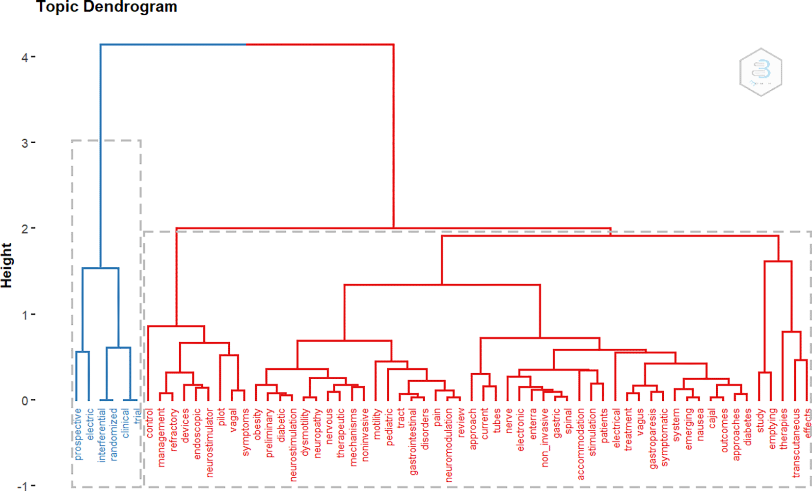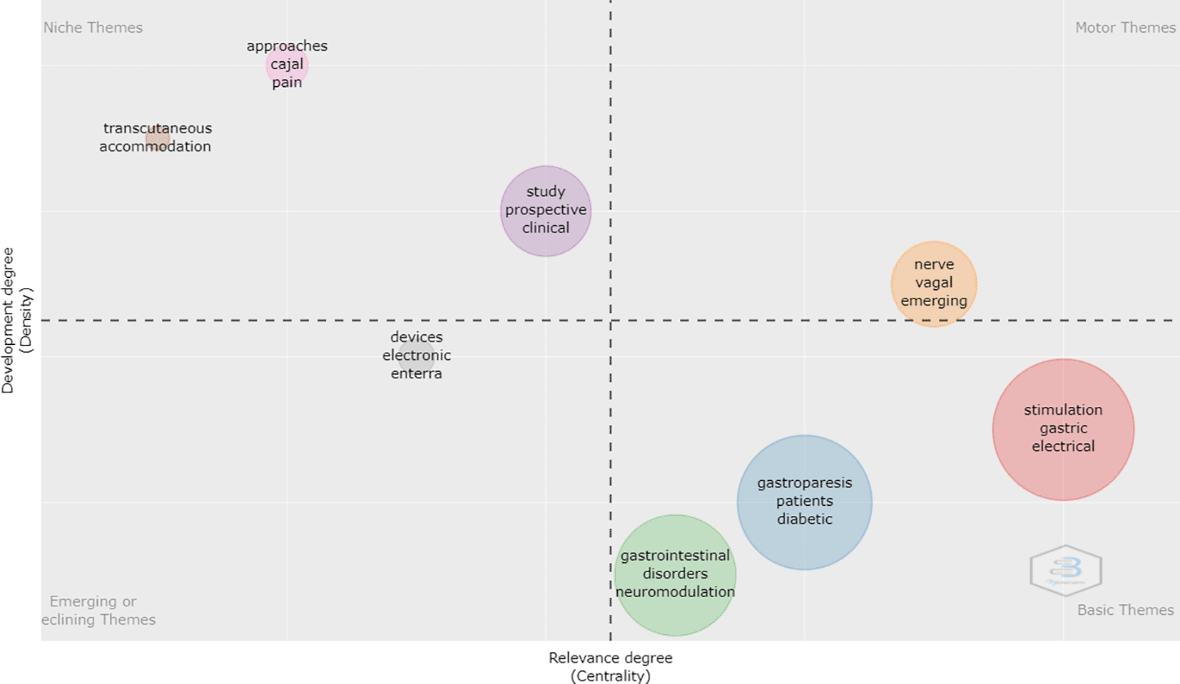 Lower Right Quadrant (Motor and Basic Themes): This quadrant represents basic motor themes with keywords such as “vagal nerve emerging,” “gastric electrical stimulation,” and larger keyword clusters including “diabetic gastroparesis” and “gastrointestinal neuromodulation." This represents an established medical practice that focuses on electrical stimulation for conditions such as diabetic gastroparesis.