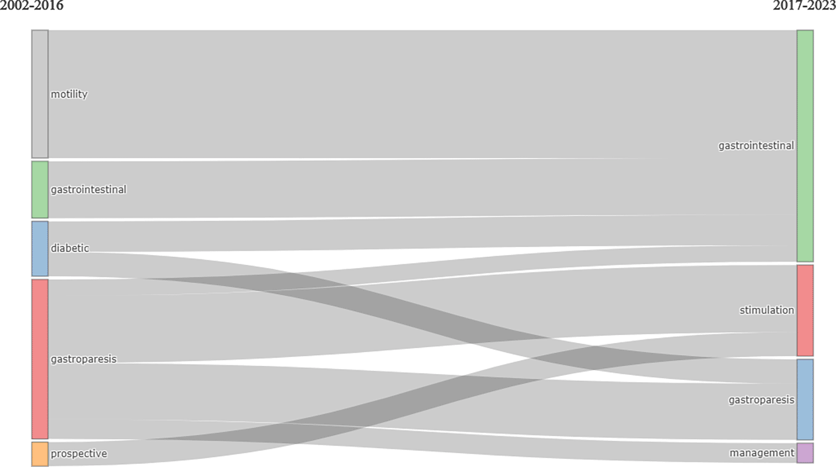 Based on Figure 13, There was an evolution of changes in themes in research in 2002–2016 with the keywords motility, gastrointestinal, diabetic, gastroparesis, and prospective. The theme then changed in 2017–2023 to gastrointestinal, stimulation, gastroparesis, and management.