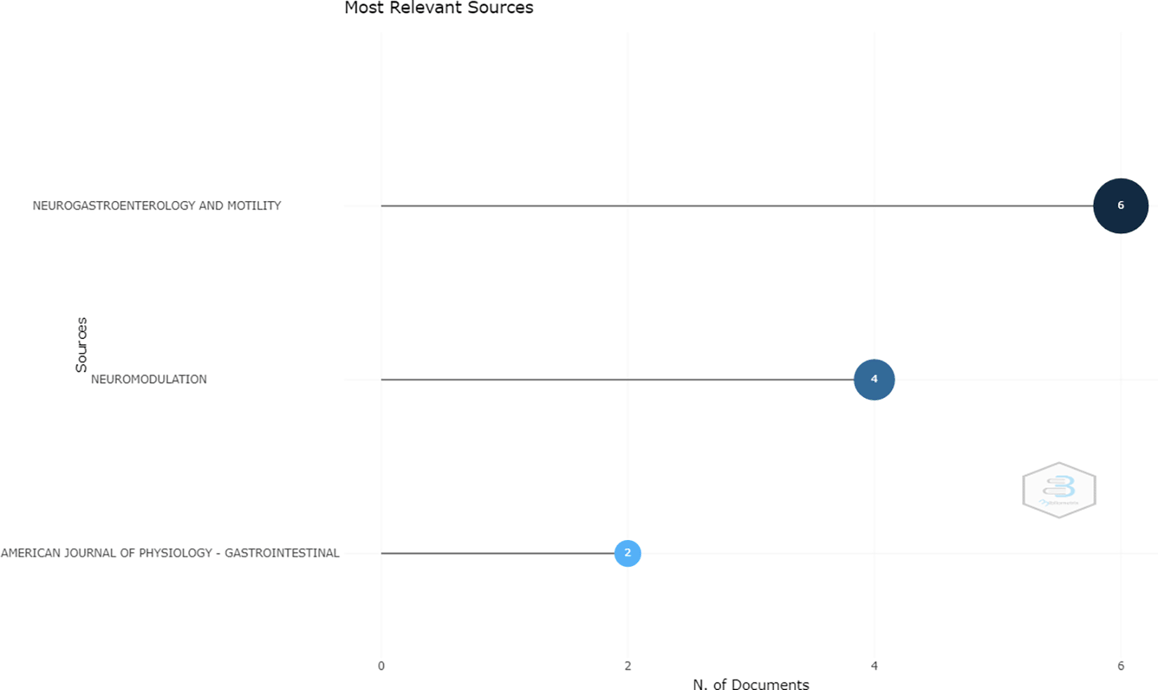 Based on Figure 2, the following are the journals that publish the most important documents: The first is neurogastroenterology and mobility. This journal has been indexed in Scopus. The Journal of Neurogastroenterology and Motility is published by Wiley-Blackwell Publishing Ltd. The SJR (Scientific Journal Rankings) for Neurogastroenterology and Motility in 2023 is 0.944. The H-index for neurogastroenterology and mobility is 126. This journal accepts articles that focus on the fields of gastroenterology and neurology, especially those related to gastrointestinal motility. Some topics that frequently appear in publications in this journal include, but are not limited to, the pathophysiology and treatment of gastroparesis, esophageal smooth muscle phenotype in achalasia, retrograde cricopharyngeus dysfunction, and the effects of trimebutine and rifaximin on glucose breath testing in patients with functional bloating.