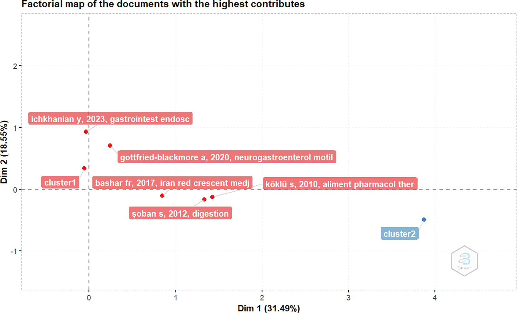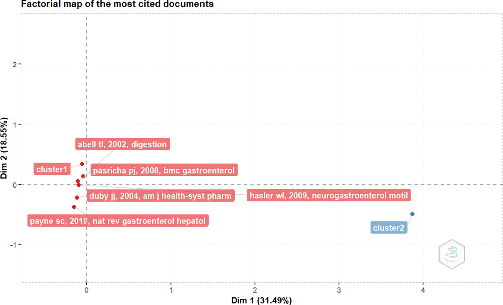 In this study we found are documents by year has been an increase in the number of documents; until 2023, there were 5 documents, most relevant sources is journal of neurogastroenterology and mobility, factorial map of the most cited documents following is a summary of a study entitled Bioelectric neuromodulation for gastrointestinal disorders: effectiveness and mechanisms by Payne SC, published in the journal Nature Reviews Gastroenterology & Hepatology, Factorial map of the documents with the highest contributes entitled Clinical trial: interferential electric stimulation in functional dyspepsia patients: a prospective randomized study by Koklu S, published in the journal Alimentary Pharmacology & Therapeutics.