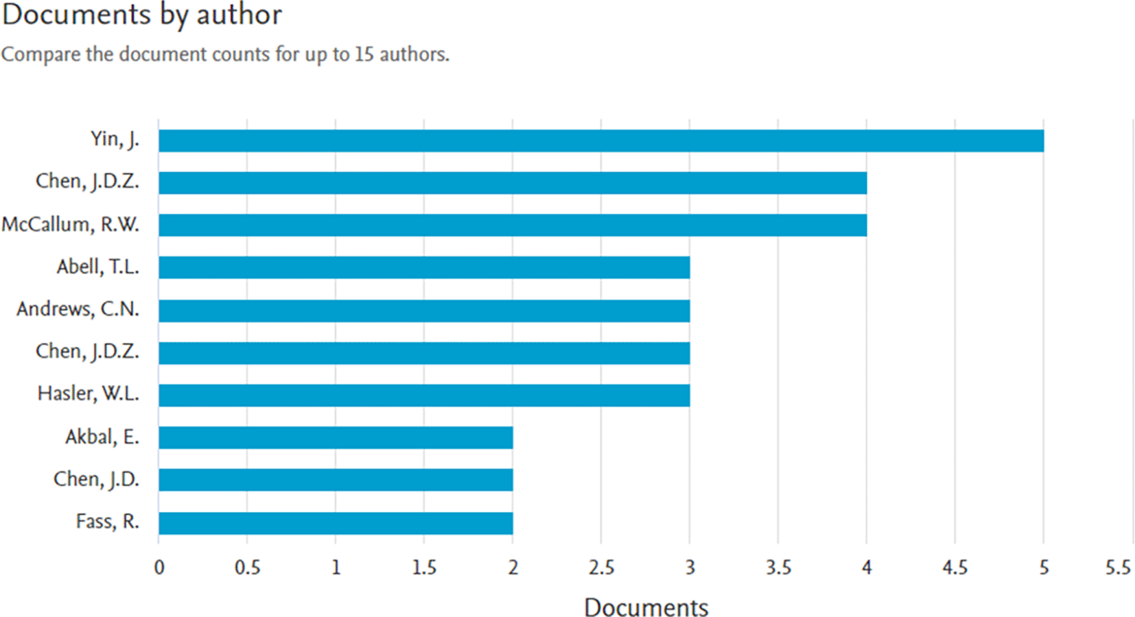 Based on Figure 5. the most authors with 5 documents are Yin, J., with the titles of several articles, namely: A novel approach in spinal cord stimulation for enhancing gastric motility: A preliminary study on canines, Emerging Gastric Stimulation for Dysmotility Disorder and Obesity, Electrical therapies for gastrointestinal motility disorders, Ameliorating effect of transcutaneous electroacupuncture on impaired gastric accommodation induced by cold meal in healthy subjects, and Gastric neuromodulation with Enterra system for nausea and vomiting in patients with gastroparesis.16–20