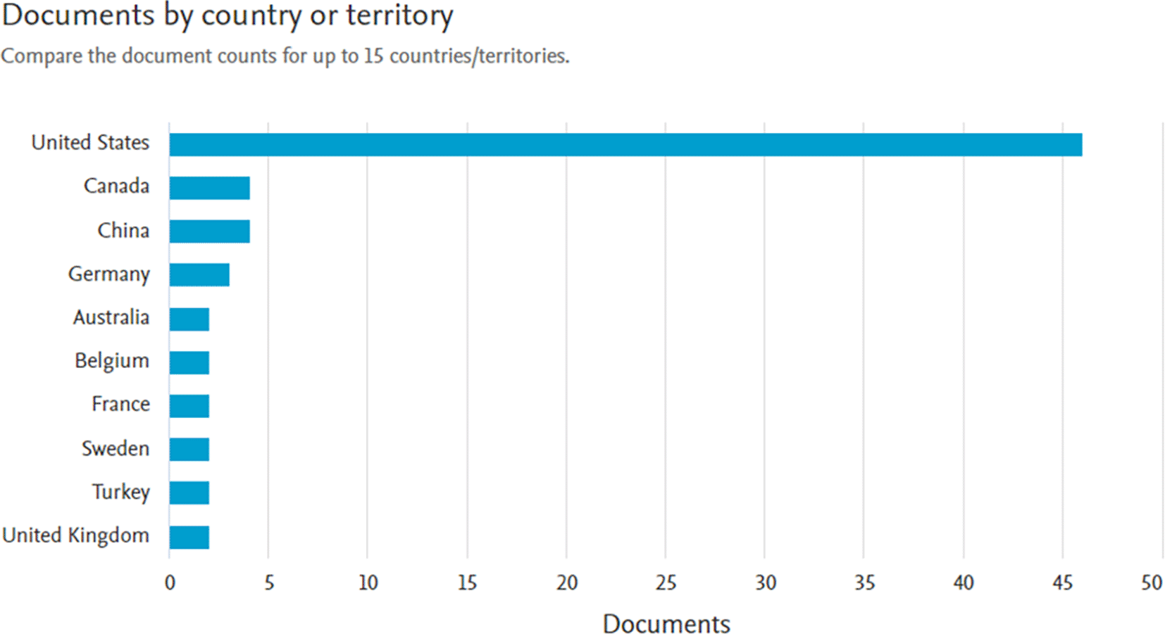 Based on Figure 6, the United States is the country with the largest number of document producers 46 documents. Followed by Canada with 4 documents, China with 4 documents, and Germany with 3 documents.