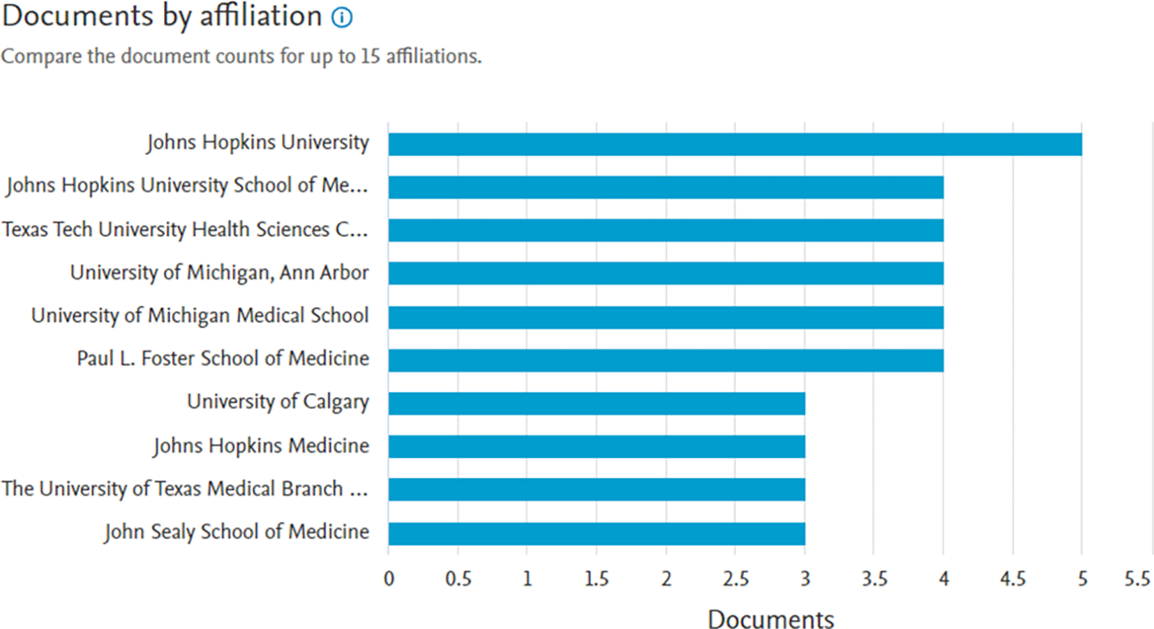 Based on Figure 8, in first place, the producer of the most documents is affiliated with the John Hopkins University with 5 documents, next in second place is affiliated with John Hopkins University School of Medicine with 4 documents and next is the Texas Tech University Health Sciences Center with 4 documents.