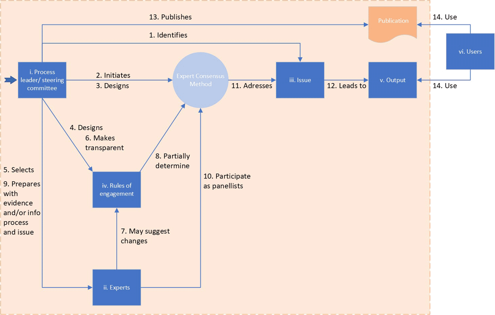 Expert consensus methods are (i) applied by a process leader or steering committee, (ii) to reach consensus or assess the degree of consensus among a group of experts, (iii) about an issue, (iv) based on pre-set rules of engagement, (v) with the aim to deliver useful output, (vi) for future users. They are characterised by constructive and procedural usage of (dis) agreement and the different arguments that are provided therein, (vi) for future users. They are characterised by constructive and procedural usage of (dis) agreement and the different arguments that are provided therein.