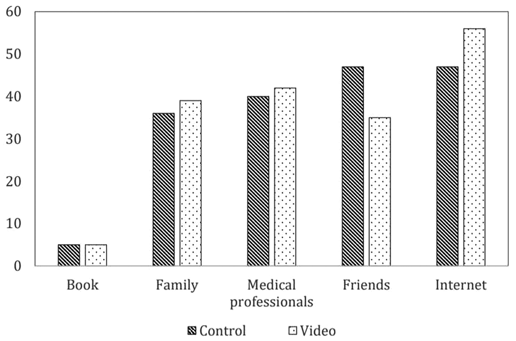 Control: standard pre-cesarean operation care; Video: informative cesarean section steps video before operation; Book: The book that provides information on preparing for cesarean delivery; Family: A group of people who are related by blood, marriage or adoption such as parents; Medical professionals: person individuals trained and qualified to provide medical care such as doctors, nurses and other healthcare providers; Friends: person whom one has a bound of mutual affection who not a member of family; Internet: internet information providing guidance on preparing for cesarean delivery.