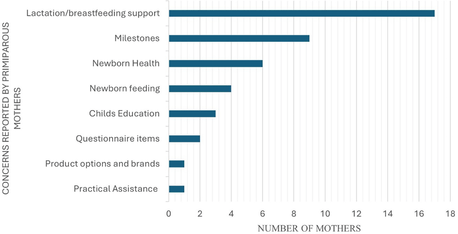 A notable increase in the number of mothers (not all) reporting heightened confidence levels in feeding-swallowing skills following receiving the N-CHFSEP was observed. This observed change (pre and post) was statistically significant as per paired t-test analysis (p <0.05) (as reported in Table 2). Considering the questions (in AQ) pertaining to feeding-swallowing skills, 89 (for Item 4) and 93 (for Item 12) primiparous mothers reported having a pre-existing understanding (pre-AQ administration) of these skills. This may be attributed to various factors such as (1) their personal experiences in observing feeding newborns within the family circle, (2) mothers prior to delivery may have self-educated themselves about feeding skills from other support networks, and (3) the availability of lactation counsellors in hospitals offering mothers with practical assistance and opportunity to discuss feeding related concerns during the hospital stay. This aligns with previous findings in India, which reported that 40% of the mothers received antenatal education on breastfeeding practices, while 61% were educated by family and friends.32 The study also reported that the majority of the mothers had good knowledge about breastfeeding and the nutritional advantages of the same, but only 45% of the mothers practised the knowledge they gained through these sources. As per the concerns obtained (AQ-Item 18) from the participants of the current study (as indicated in Figure 5), certain mothers reported concerns about breastfeeding knowledge and support. These included concerns towards deciding the feeding position, feeding duration, feeding schedule, feeding precautions, post-feeding management, aspiration management, and the type of feeds. The evident increase in the confidence levels (p <0.05) of the primiparous mothers (in the current study) in identifying newborn feeding schedules and understanding of exclusive breastfeeding for six months (AQ-Item 4 and 12), can be attributed to the adequate information provided in N-CHFSEP such as ‘exclusive breastfeeding’, ‘burping’, ‘feeding duration’ and ‘schedule’, and ‘awareness on the usage of formula feeds’. This provision of information likely complemented their existing knowledge of newborn feeding and swallowing skills. Moreover, practical demonstrations by lactation counsellors further reinforce their understanding, contributing to an increase in their confidence levels as reported in Table 2. This finding is consistent with the findings of a systematic review done on the effectiveness of educational programs related to breastfeeding and supportive programs for primiparous mothers. The studies reported the mothers to have increased breastfeeding knowledge and self-efficacy, thereby increasing the frequency of breastfeeding.33