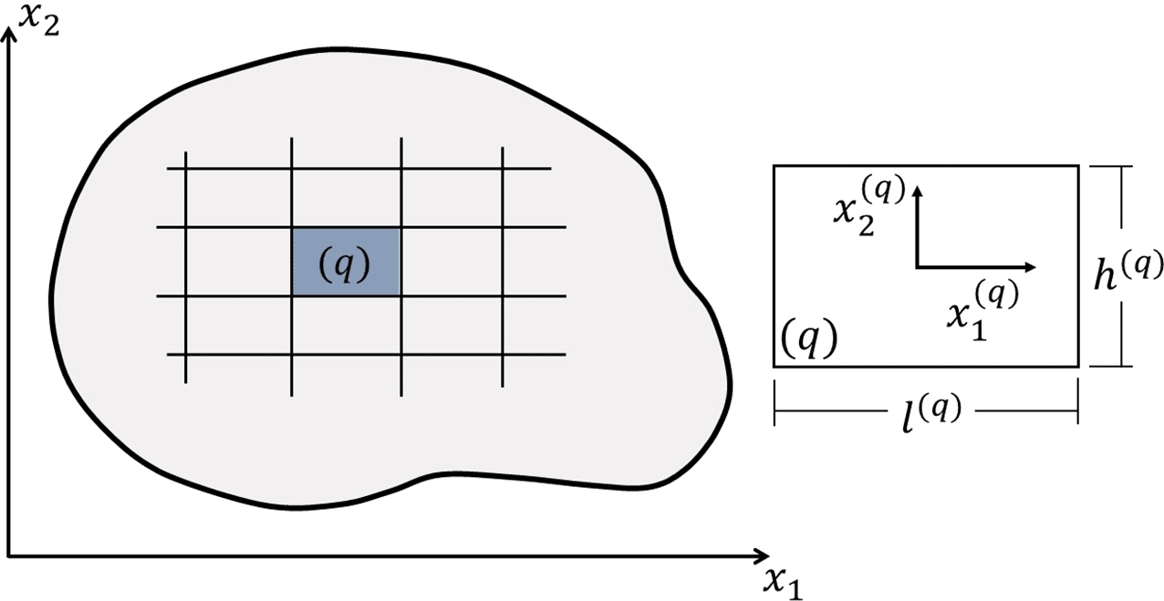Figure 1 presents the analysis domain in plane, which is discretized in subvolumes. The subvolume dimensions are and for , where and represent the local coordinate system. Following Cavalcante and Pindera (2012a), the displacement of a subvolume can be approximated by an incomplete quadratic version of Legendre polynomial expansion in the local coordinate system as follows: