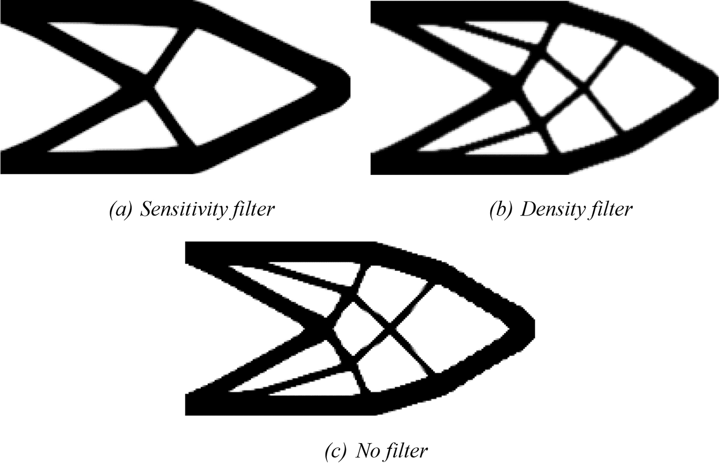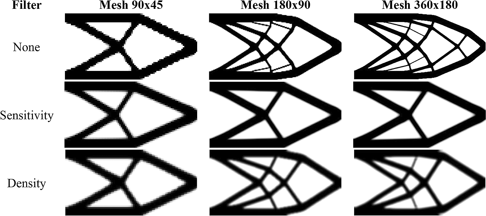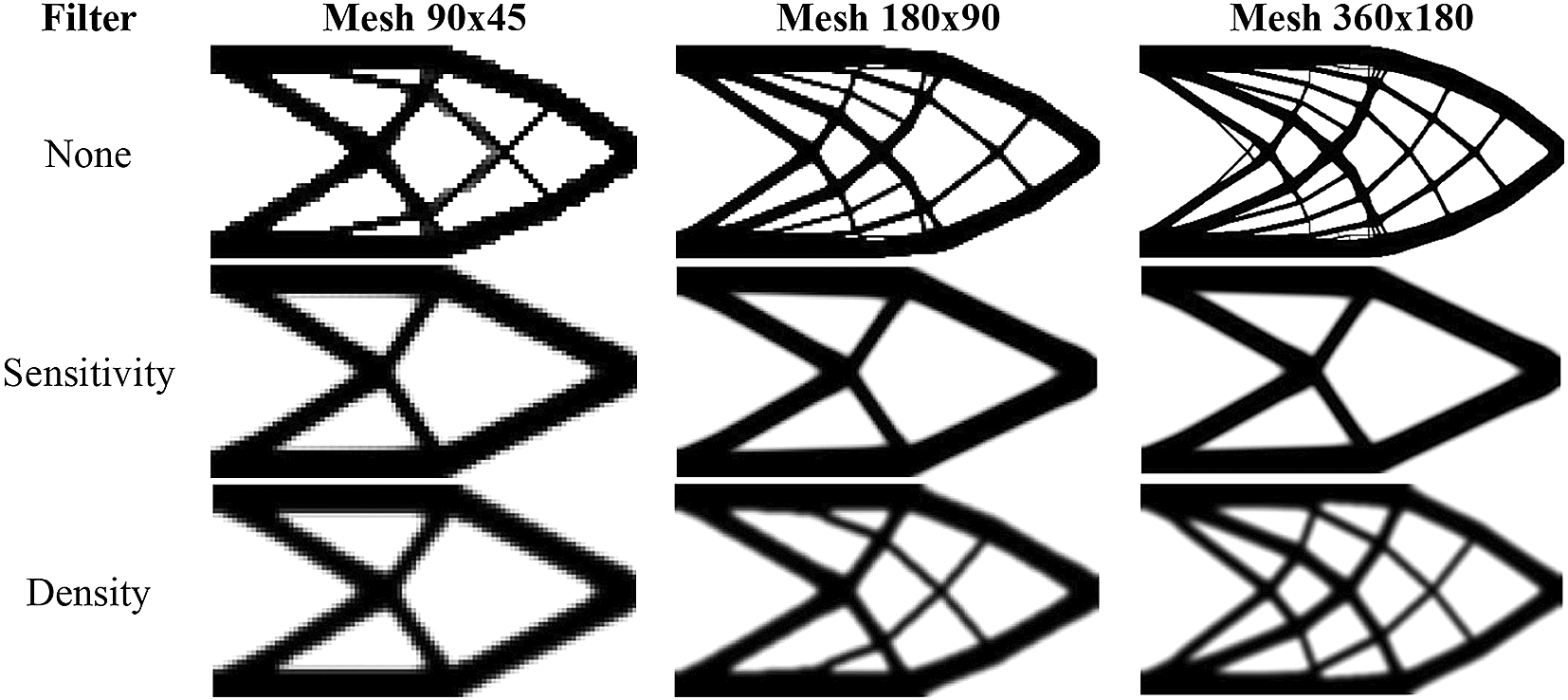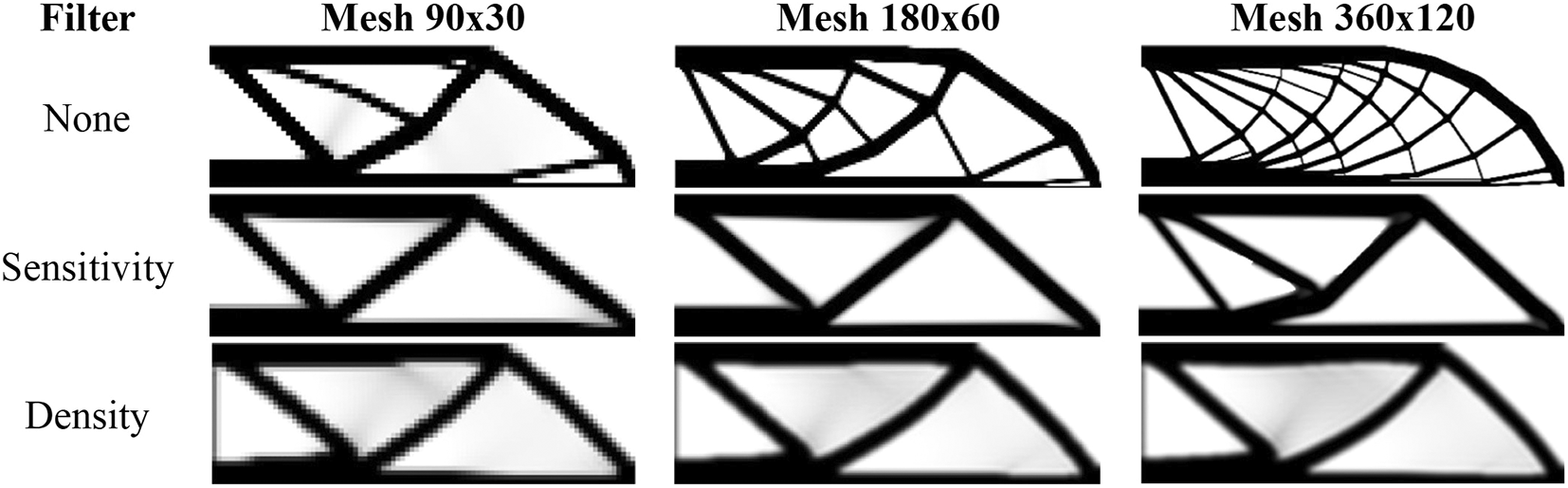 Figure 9 shows the obtained optimized topologies for the approach based on the finite-volume theory considering the SIMP material interpolation method, while Table 2 presents the investigated numerical parameters for each performed analysis. Although the non-filtering approach has obtained the lowest value for the objective function, the sensitivity filter results have presented the lowest computational cost and optimized topologies that better controls the length scale issue, by reducing the formation of thin bars. The density filtering results have shown more thin bars in the optimized topologies when compared to the sensitivity filter, and higher values for the compliance function in the overall investigation. For the SIMP method and considering the non-filtering strategies, the damping factor is adjusted to 1/2.6 to avoid divergence during the optimization process.