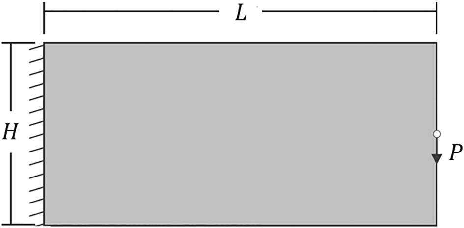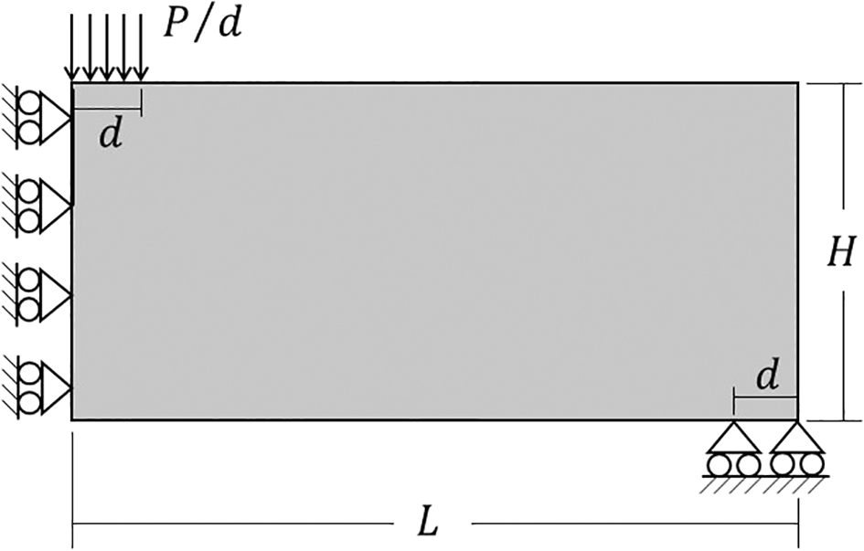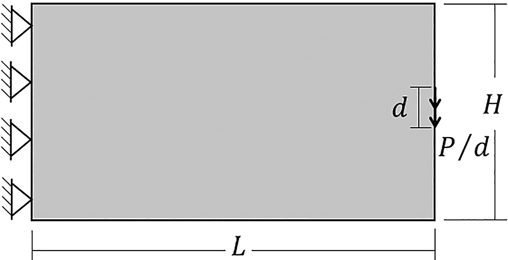The performed example is a cantilever deep beam subject to a concentrated load, as shown in Figure 5. In this case, the vertical and horizontal averaged displacements at the edges of the left border of the structure are fixed, so the supp vector is set up as