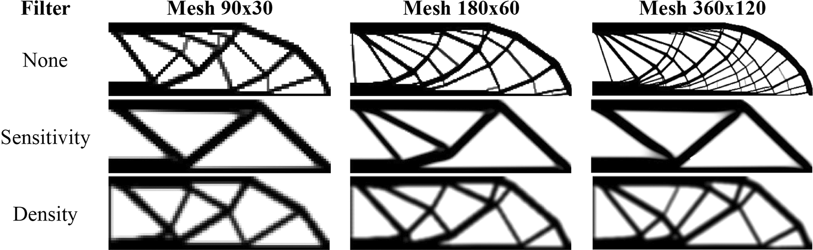 Table 2 presents the numerical aspects of the performed investigations for the cantilever deep beam example. In general, the RAMP method has presented a higher number of iterations and processing time, although the obtained optimized topologies have presented the lowest values for the objective function. The filter radius is calculated to be slightly higher than for the coarse mesh. Therefore, the optimized topology obtained for the finest mesh employing the sensitivity filter is very similar to that obtained for the coarse mesh without filtering techniques. This is only possible because the finite-volume theory is a checkerboard-free numerical technique in topology optimization algorithms.