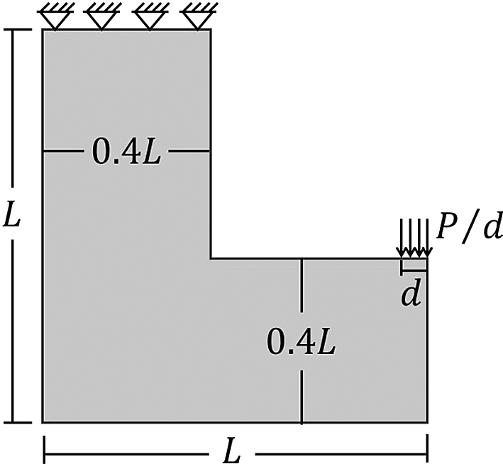 Another analyzed topology optimization problem for stress concentration in two-dimensional structures is the L-bracket beam, whose analysis domain and boundary conditions are illustrated in Figure 14. In the L-bracket beam problem, it is observed a high level of stress concentration in the corner, which is important to check how the new Top2DFVT code leads to these kinds of topology optimization problems. The employed geometric parameters for this beam are assumed as cm, cm, and kN, while the adopted material properties are GPa (elastic moduli) and (Poisson’s ratio). The proposed optimization problem consists of minimizing the structural compliance function under a volume constraint of 40% of the total volume.