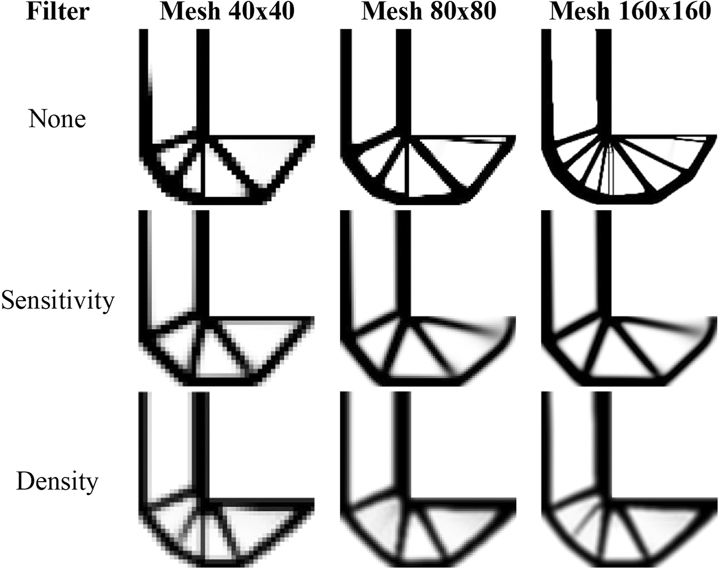 Figure 16 presents the obtained optimized topologies by the RAMP method for the L-bracket beam problem. The RAMP method has generally reduced the formation of thin bars, demonstrating less sensitivity with the adopted meshes. As in the SIMP method, the sensitivity filter has shown to be more efficient by reducing the formation of thin bars in the optimized topologies, and the density filter has obtained more irregular topologies with the presence of gray regions. The RAMP method is more stable numerically, and the adopted damping factor is 1/2, which guarantees a faster convergence for the analyses. However, the number of iterations is usually higher for the RAMP method.