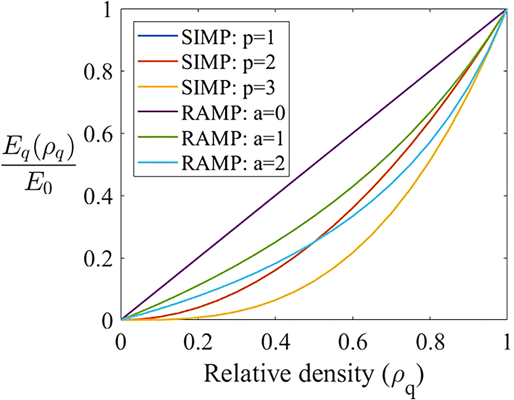 In topology optimization algorithms, the interest is in determining whether we should put material or not, which generates a “black and white” design. Therefore, the structural material distribution is obtained by a binary “0-1”, where 0 indicates void and 1 indicates the presence of material. However, this kind of topology optimization algorithms lead to an integer programming problem, which has revealed to be an unfeasible approach for large scale topology optimization problems. An alternative approach is the SIMP (Solid Isotropic Material with Penalization) method, which has been extensively used due to its versatility, convergence, and ease implementation (Rozvany, 2009). In this approach, the material properties can be evaluated inside each element of the discretized domain, and the design variables are the elements’ relative densities. Therefore, the mechanical properties are modeled by the material relative density raised to a penalty factor that penalizes their intermediate values. Another interpolation scheme to penalize intermediate values of relative density is the RAMP (Rotational Approximation of Material Properties) method proposed by Stolpe and Svanberg (2001), which employs a concave penalty function to suppress these intermediate values in the objective function. Unlike the SIMP method, the RAMP model presents non-zero sensitivity at zero density, so this model is especially efficient to remedy some numerical difficulties presented in problems with very low densities (Deaton and Grandhi, 2014).