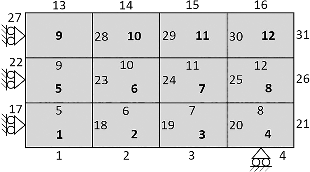 The subvolume is indexed row-wise from left to right and down to up, as represented by the bold number shown in Figure 4. Similarly, the subvolume faces are numbered from left to right and down to up, however, the horizontal faces are first indexed, followed by the indexing of the vertical faces, as illustrated in Figure 4. As a result, two DOFs are defined in each subvolume face, where the DOFs and correspond to the horizontal and vertical displacement of face j, respectively. The DOFs assemblage is operated by the subroutine: