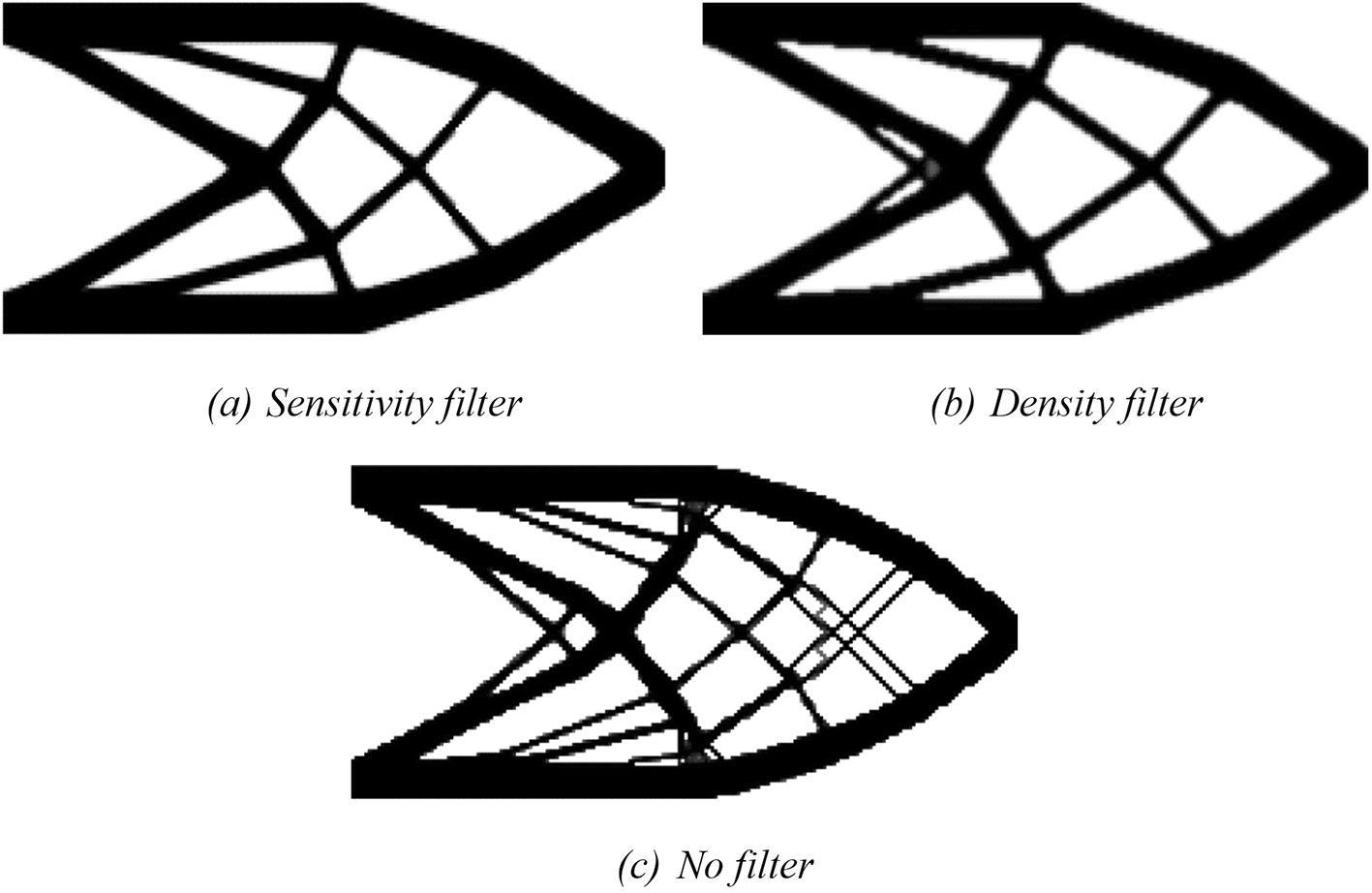 For the RAMP approach, the penalty factor variable is adjusted to penal = 0:0.5:3, and the variable model is modified to ‘RAMP’. The optimized topologies obtained for the RAMP model are shown in Figure 7, considering the application of the sensitivity filter, Figure 7a, density filter, Figure 7b, and no filtering, Figure 7c. In general, they are checkerboard-free optimized topologies with a reduction in the obtained structural compliance values compared to the optimized topologies generated by the SIMP model, as presented in Table 1. The no-filter approach generated an optimized structure like the optimized topologies obtained by employing the SIMP model and mesh-independent filters. Thus, the RAMP model coupled with the finite-volume theory has shown to be checkerboard-free and mesh-independent for the cantilever deep beam example, which are desired features for manufacturing purposes. In addition, the sensitivity filter for RAMP model has obtained better results by reducing the optimized structural perimeter even more. Table 1 also presents the investigated numerical aspects for the cantilever deep beam example considering the RAMP model. The approach based on the sensitivity filter has presented the lowest number of iterations and computational cost, while the density filter has shown the highest processing time. The minimum value for structural compliance is observed when the no-filtering technique is employed.