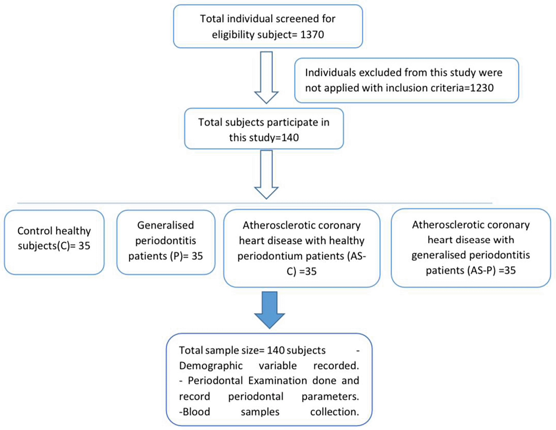 Inclusion criteria included individuals (a) through an acceptance to participate in the investigation, (b) in excellent general wellness, other than a diagnosis of atherosclerosis from a heart catheter technique, and without any other systemic illnesses. Elimination standards involved individuals (a) with physical disorders, (b) undergoing periodontal therapy within the previous period of six months, (c) were smoking behavior, (d) had reserved inflammation inhibitor medicine in the previous period of three months; and (e) were either breastfeeding or pregnant when the research was conducted. Following the recruitment of research entrants, each participant signed a declaration of consent. After that, every entrant’s blood sample was taken, clinical evaluations were thoroughly documented, and demographic details were noted.