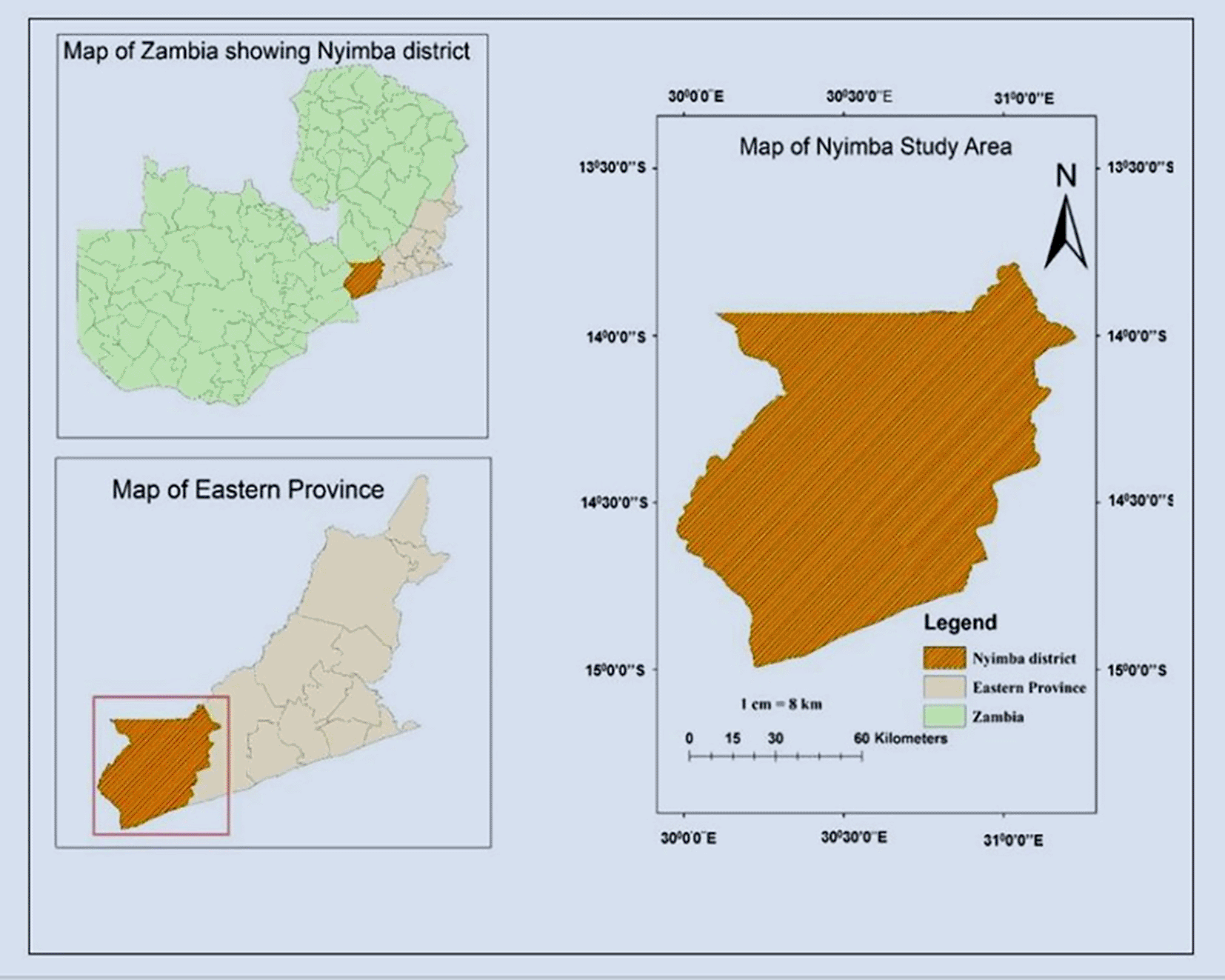 The research was carried out in Nyimba district of Eastern Province Zambia. The district is situated 334 kilometers East of Lusaka Zambia’s national capital. In the South the district borders with Mozambique, North with Muchinga province, West with Lusaka province, and East with Petauke district. The district lies between latitude (13°30′1019″ and 14°55′81426″ South) and longitude (30° 48′5047″ and 31°48′20252′′East) ( Figure 2).