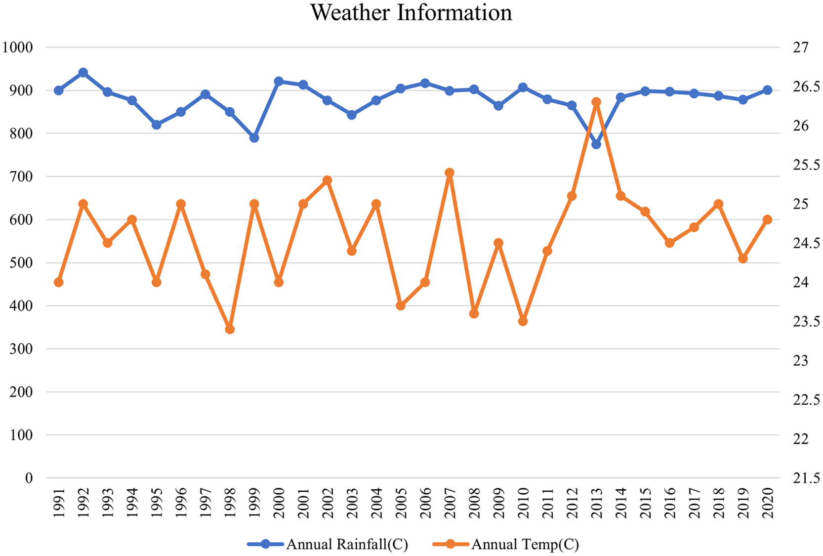 Zambia is divided into three agro-ecological zones: Zone I, Zone II (subdivided into IIa and IIb), and Zone III. Nyimba district falls within Zone I, which covers the Southern and Eastern rift valleys of the Zambezi and Luangwa River basins. This zone also extends to parts of the Western and Southern provinces in the south of Zambia. The average annual rainfall in Nyimba district ranges from 600 to 900 mm, with the wettest months being December to February and a distinct dry season from May to November. The annual mean temperature is 24.2°C, while the daily temperature range is from 10.3°C to 36.5°C ( Figure 3). Topographically, the district comprises hills and plateaus, with soils characterized as Lithosol-Cambisols, while in the valleys, the soils are classified as Fluvisol-Vertisols. The elevation varies from 450-1000 m at the bottom of the Luangwa River valley, extending to the plateau near the Nyimba district center and reaching even higher altitudes on the mountain tops in the western part of the district.