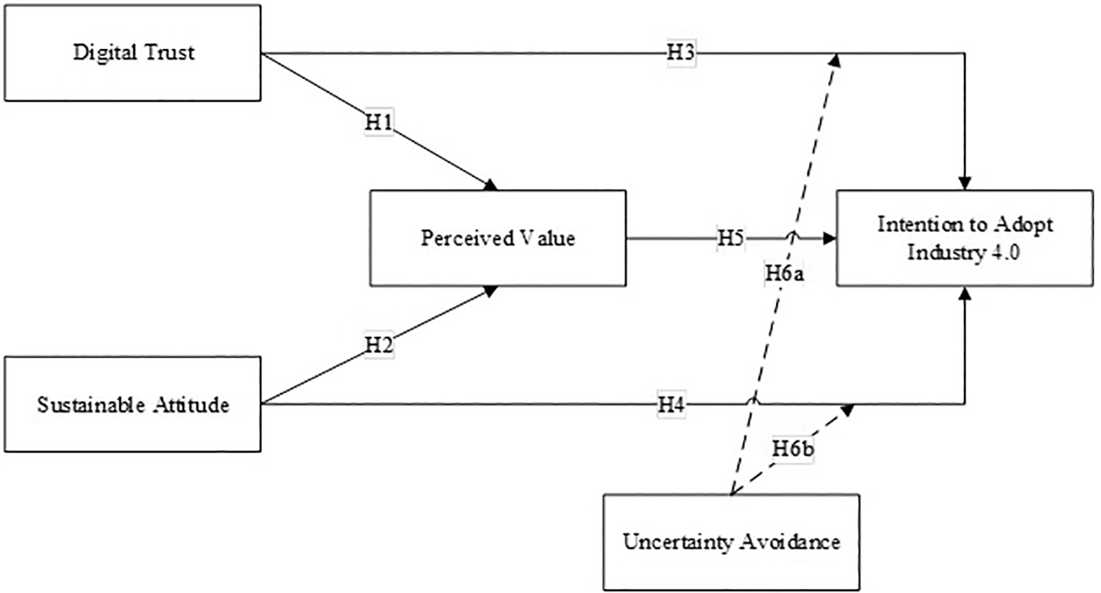 The conceptual framework of this research is illustrated in Figure 1. This model hypothesizes to explain H1: the relationship between Digital Trust and Perceived Value, H2: the relationship between Sustainable Attitude and Perceived Value, H3: the relationship between Digital Trust and Intention to Adopt Industry 4.0, H4: the relationship between Sustainable Attitude on Intention to Adopt Industry 4.0, H5: relationship between Perceived Value and Intention to Adopt Industry 4.0, H6a: The moderating role of Uncertainty Avoidance on the relationship between Digital Trust and Intention to Adopt Industry 4.0. H6b: The moderating role of Uncertainty Avoidance on the relationship between Sustainable Attitude and Intention to Adopt Industry 4.0.