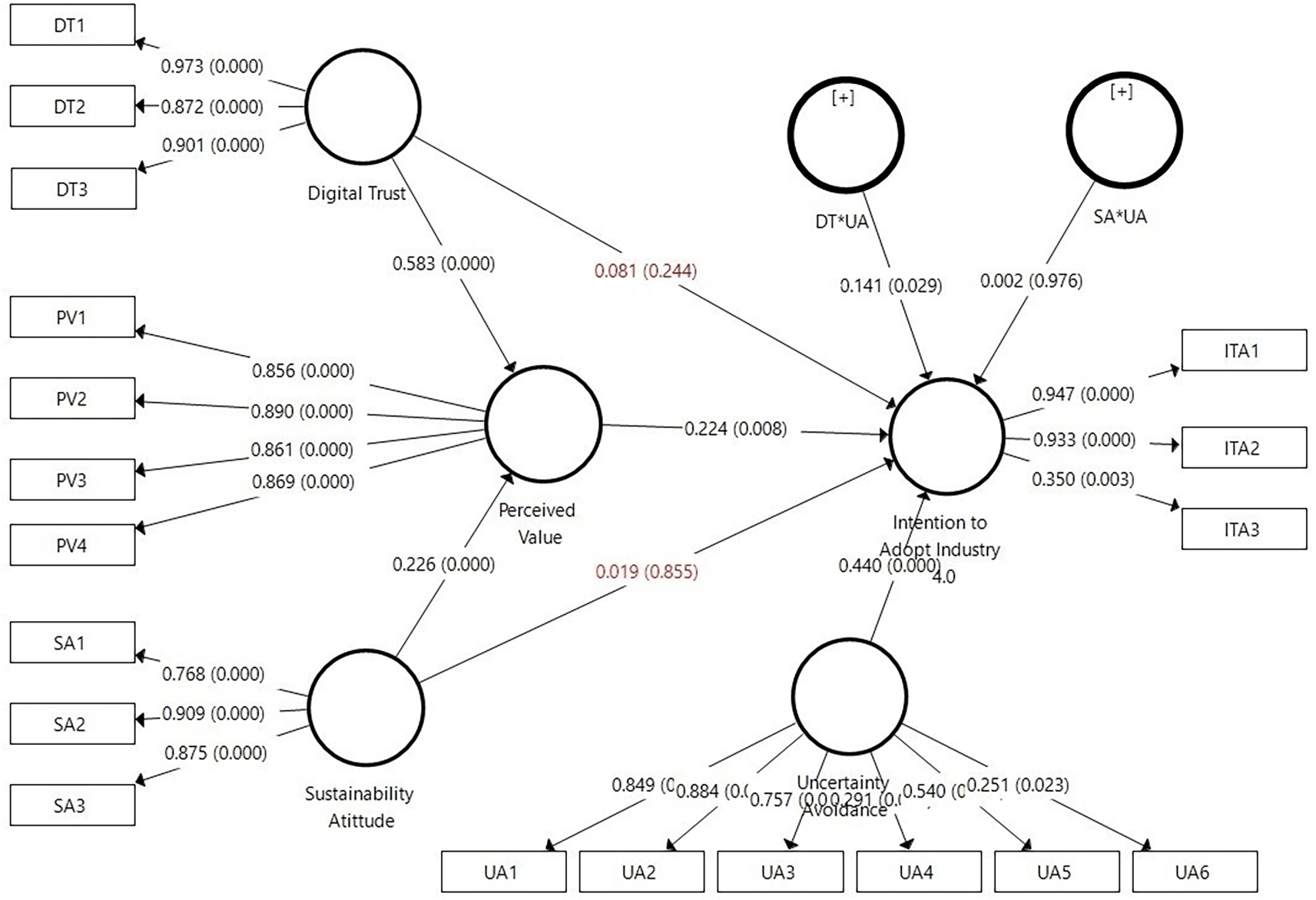 The hypothesis testing results using PLS-SEM with SmartPLS indicate that H1 is accepted, where digital trust has a positive and significant effect on the perceived value (β=0.583, p≤0.001). H2 of this study is also accepted, where sustainable attitude has a positive and significant effect on the perceived value (β=0.226, p<0.001). However, H3 (β=0.081, p=0.224) and H4 (β=0.019, p=0.855) of this study are rejected because their p-values are greater than 0.05, indicating that digital trust and sustainable attitude do not significantly influence the intention to adopt Industry 4.0. Furthermore, H5 of the study shows the expected results, where perceived value has a positive and significant effect on the intention to adopt Industry 4.0 (β=0.224, p=0.008). Regarding the moderating effects, H6a stating that uncertainty avoidance positively moderates the relationship between digital trust and intention to adopt Industry 4.0 (β=0.141, p=0.029), is accepted. However, H6b of this study is rejected because uncertainty avoidance positively and insignificantly moderates the relationship between sustainable attitude and intention to adopt Industry 4.0 (β = 0.002, p = 0.976). Clearly, the results of hypothesis testing can be seen in Table 4 and Figure 2.