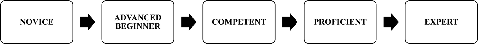 Many institutions and alternative educational providers are exploring the intricacies of developing a CBE programs. An article by A. Sasha Thackaberry outlines how the increasing sophistication of CBE programs has largely been possible due to technological improvements. (Thackaberry, 2016a, 2016b) The ACGME refers to the Dreyfus Model (1986) to outline competencies for its programs which require guidelines on methodology training. Hubert and Stuart Dreyfus, who were assigned by the U.S. Air Force, came up with the concept to explain how a pilot’s knowledge and abilities grow. This model, has five levels of proficiency (Figure 4), in an increasing order of mastery learning which can be referred as milestones of a learner’s progression (Sultan, et al., 2019).