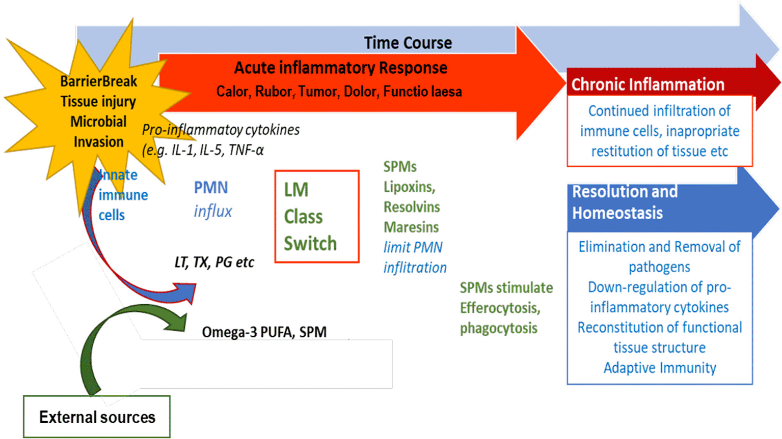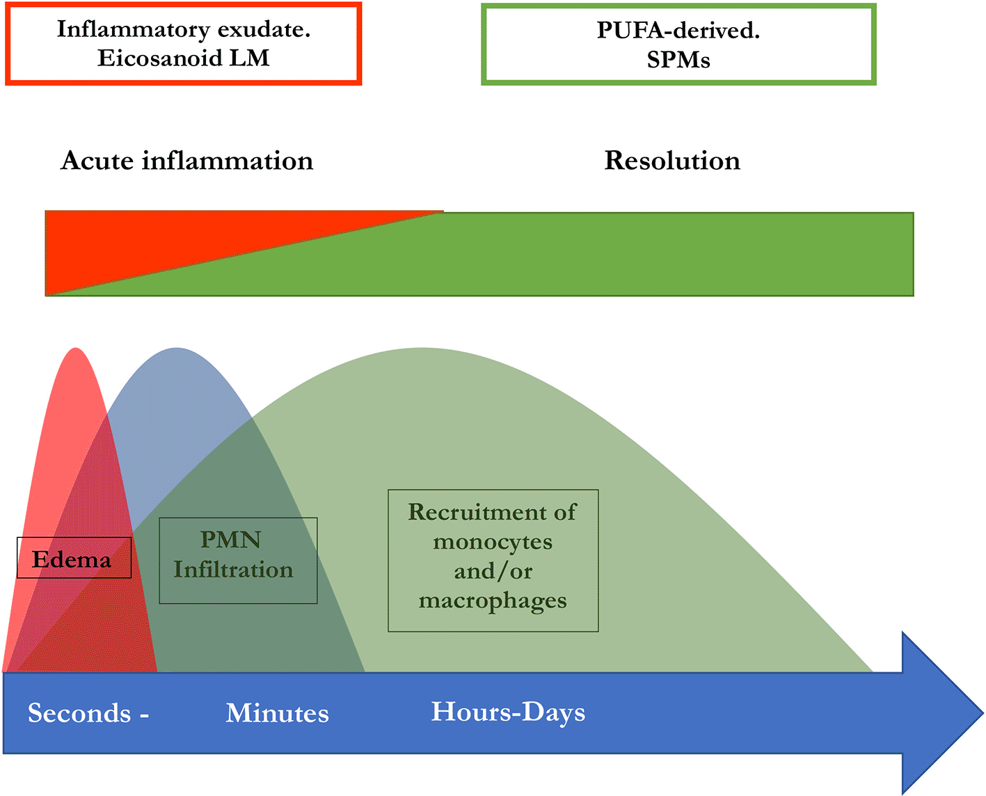 Several key steps are responsible for the termination of inflammatory processes: dead cells have to be removed, a conversion of macrophages to resolving M2 macrophages must be initiated, and the recruitment of neutrophils must be stopped (Serhan et al. 2002, Serhan and Chiang 2013, Serhan 2017, Schett and Neurath 2018, Serhan and Levy 2018). SPMs have a vital role in the termination of neutrophil infiltration and in the initiation of phagocytosis of apoptotic cells. Besides, they are involved in the downregulation of pro-inflammatory cytokines, such as TNF-α, IL-6, IL-8 and IL-12, the reduction of platelet-activating factor and prostaglandin production. In addition to that, SPMs are also involved in the clearance of the infection site and tissue regeneration, by stimulating efferocytosis and phagocytosis, promoting wound healing. These resolutive processes are triggered simultaneously to inflammation which is evident from the interlinkage of prostaglandin synthesis with the SPM biosynthetic pathways. Both the generation of pro-inflammatory lipid mediators and the subsequent synthesis of inflammation- mediating SPMs are promoted by polymorphonuclear leukocytes (PML) (Levy et al. 2001). This implies a lipid mediator class switch in these cells which is essential for a regulated resolution of inflammation and thus for the prevention of chronification (Levy et al. 2001). PGE2 as well as PGD2 are necessary to induce lipoxygenases which are in turn necessary for the generation of LXs, Rvs, and Protectin D1 (Serhan and Savill 2005). Therefore, the switch of the lipid mediator class from a proinflammatory to a pro-resolutive function is disrupted when PG synthesis is inhibited. Hence, this may result in impaired resolution (Bandeira-Melo et al. 2000, Levy et al. 2001). In summary, the initiation of inflammation is inseparably linked to its active resolution, thus the beginning of the signaling cascade programs the end (Serhan and Savill 2005). An illustration of this perception of inflammation is available in Figure 2.