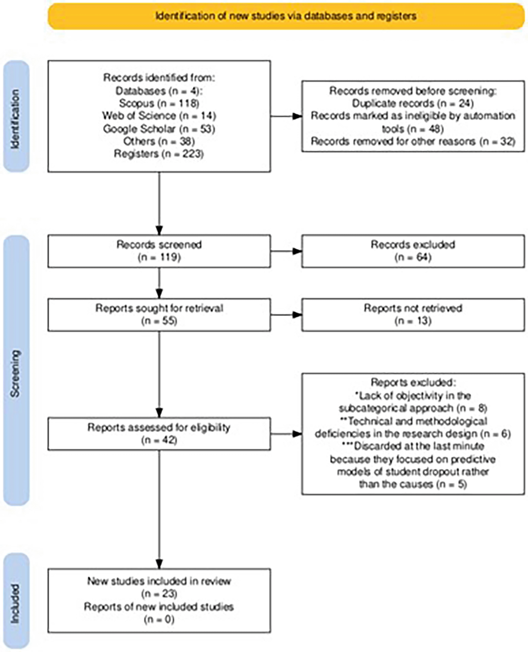 Studies published outside the period from 2020 to June 2024, documents that were not research articles, and those that did not specifically focus on university dropout or did not consider at least 50% of the study subcategories were excluded. Studies with poor methodological design were also discarded (Table 1).