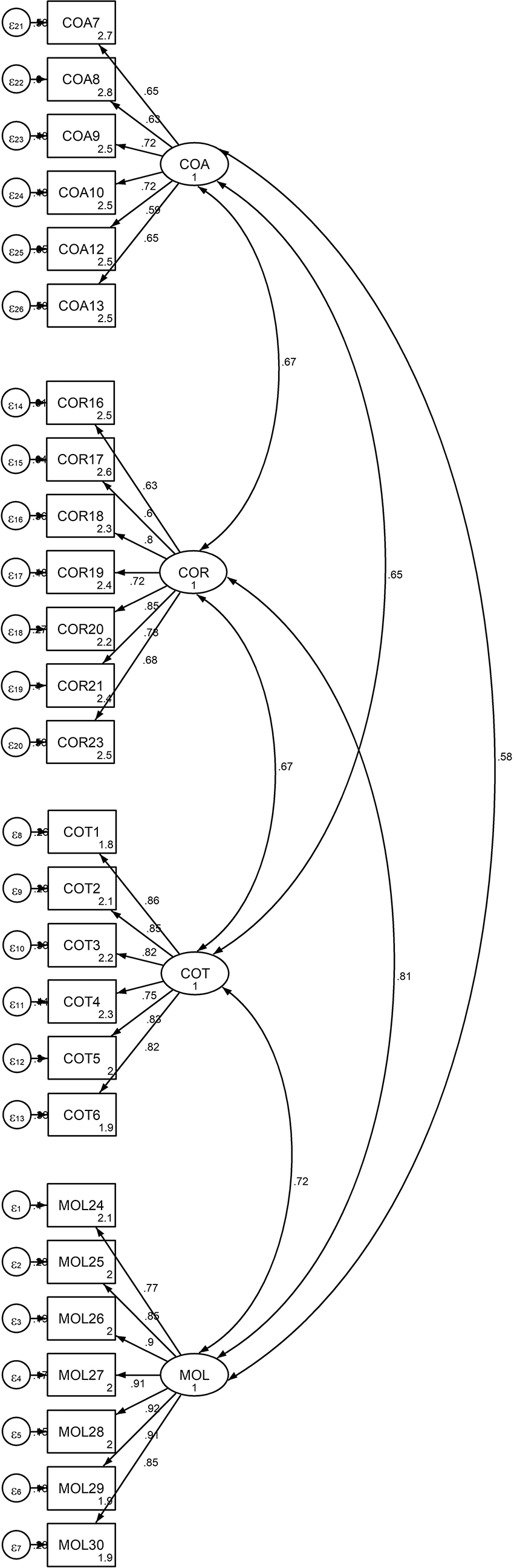The details of the factor loadings and communalities are as follows: Factor One: Comprising seven items (MOL55-MOL61) with loadings ranging from .58 to .93 and communalities from .72 to .87. Factor Two: Comprised six items (COT5-COT11) with loadings between .61 and .81 and communalities from .60 to .73. Factor Three: Included seven items (COR45-COR52) with loadings from .51 to .71 and communalities ranging from .41 to .69. Finally, Factor Four: Consisted of six items (COA22-COA30) with loadings between .52 and .66 and communalities from .37 to .53.