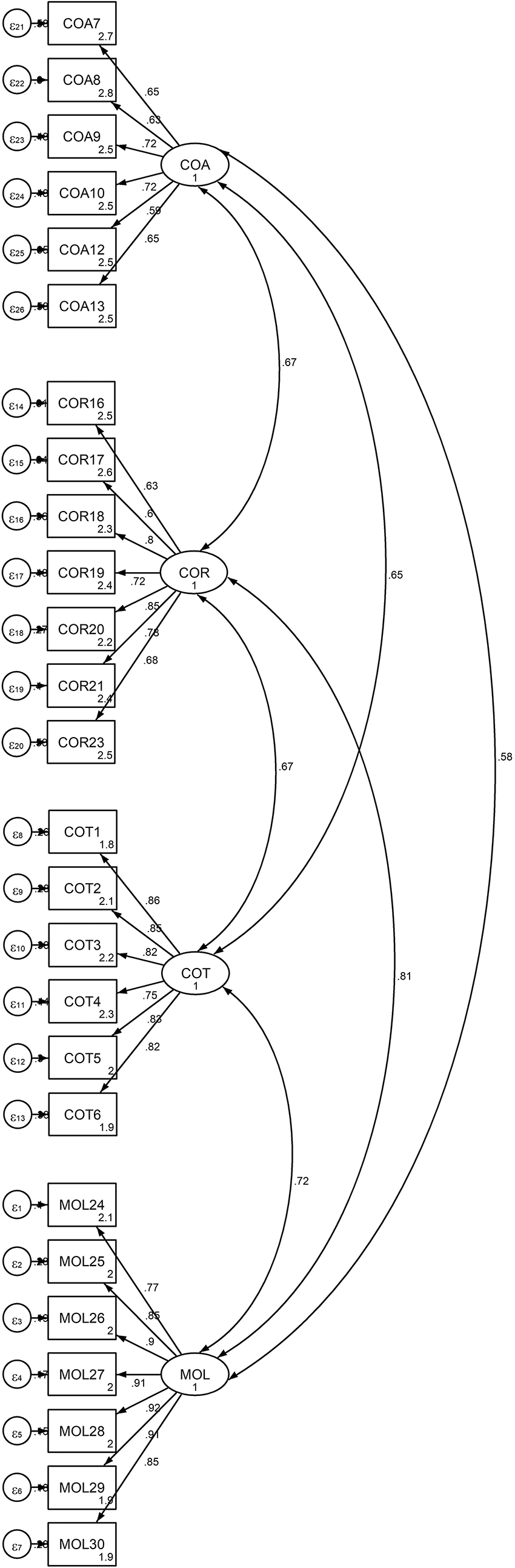 The details of the factor loadings and communalities are as follows: Factor One: Comprising seven items (MOL55-MOL61) with loadings ranging from .58 to .93 and communalities from .72 to .87. Factor Two: Comprised six items (COT5-COT11) with loadings between .61 and .81 and communalities from .60 to .73. Factor Three: Included seven items (COR45-COR52) with loadings from .51 to .71 and communalities ranging from .41 to .69. Finally, Factor Four: Consisted of six items (COA22-COA30) with loadings between .52 and .66 and communalities from .37 to .53.